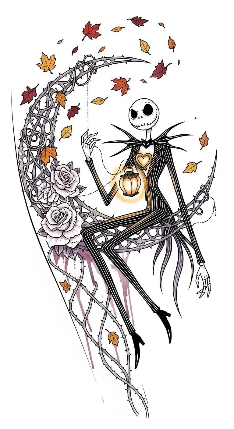 Let Jack’s spirit inspire your self-expression and celebrate your unique story. The crescent moon and thorned vines symbolize the balance of whimsy and struggle, the heart-shaped lantern represents inner light and personal growth, and the stitched roses echo themes of repair and resilience; emotionally the piece evokes nostalgia and gentle melancholy, making it ideal for placement on the forearm for daily visibility or the upper back for a more intimate, larger composition.