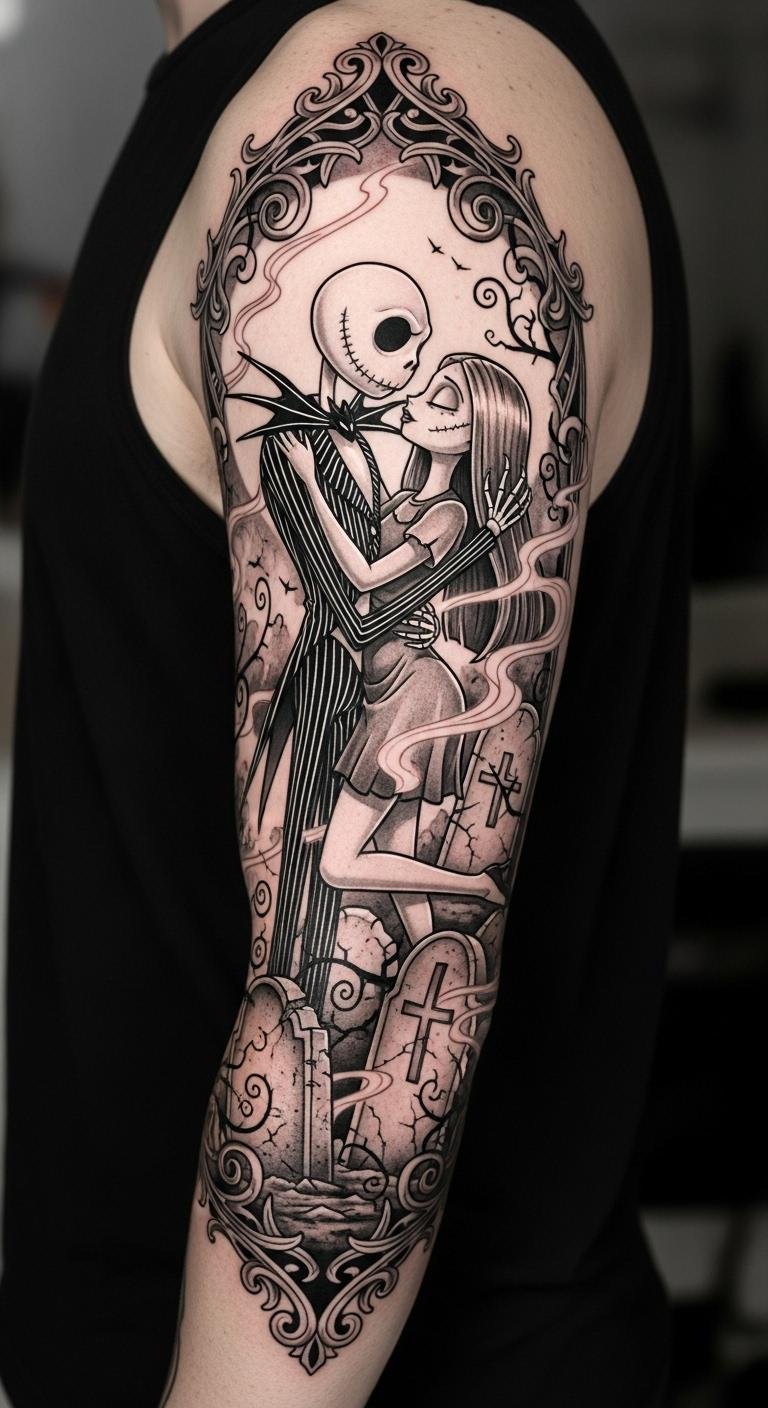 While exploring the haunting beauty of *The Nightmare Before Christmas*, black and grey gothic tattoos evoke a striking sense of nostalgia and depth.