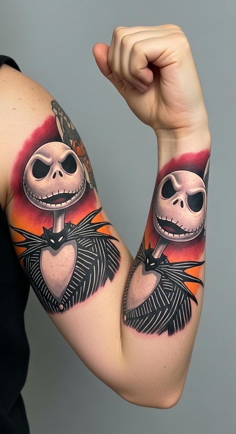 Bicep placement emphasizes strength and personal identity; the Jack Skellington portrait symbolizes embracing uniqueness, playful rebellion, and the joy found in embracing the eerie and whimsical.