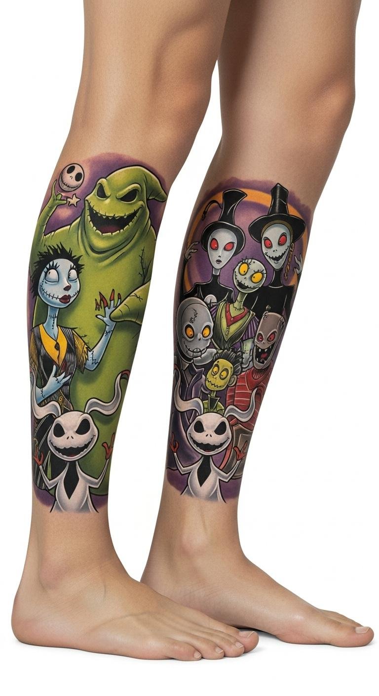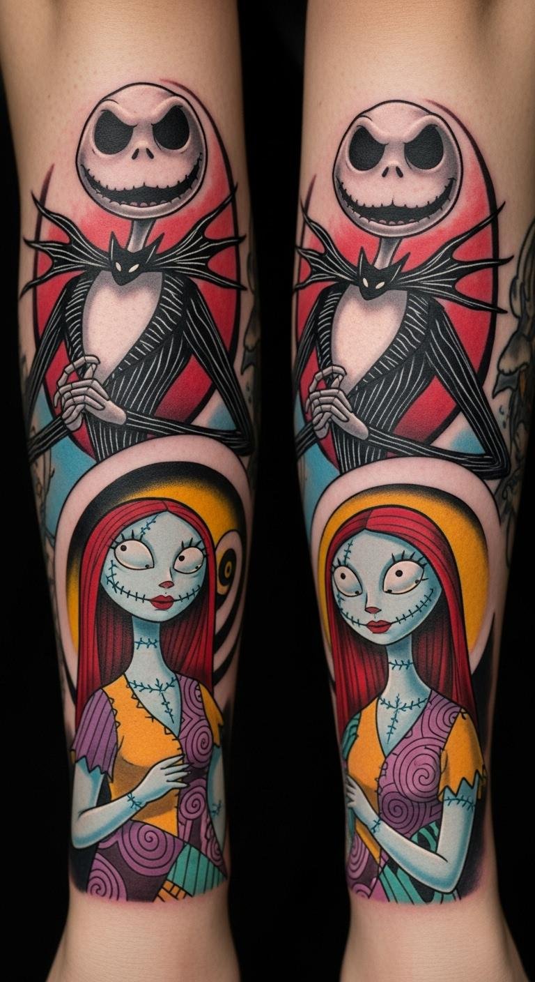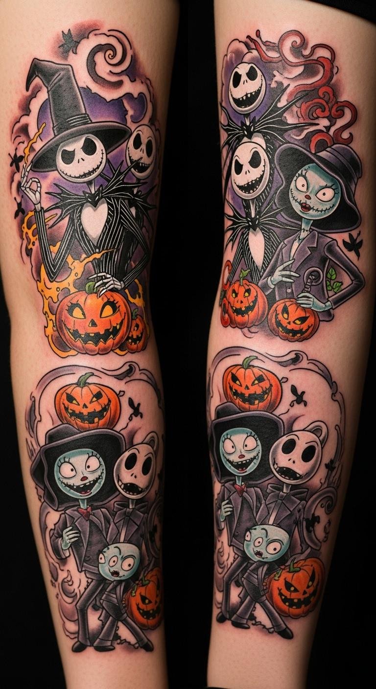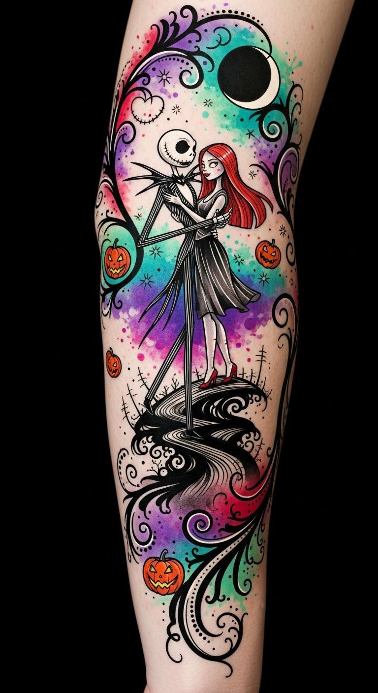 Many fans of *The Nightmare Before Christmas* are drawn to neo-traditional tattoos for their vibrant colors and bold outlines that breathe new life into beloved characters.