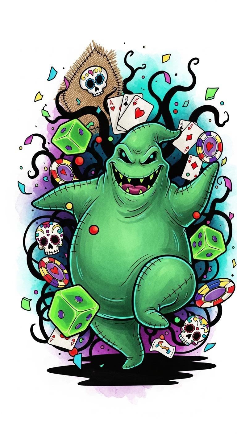 This design symbolizes the joyful menace of playful villainy—dice and poker chips representing chance and fate, stitched burlap and shadowed tendrils for the character’s ragged exterior and lurking danger.