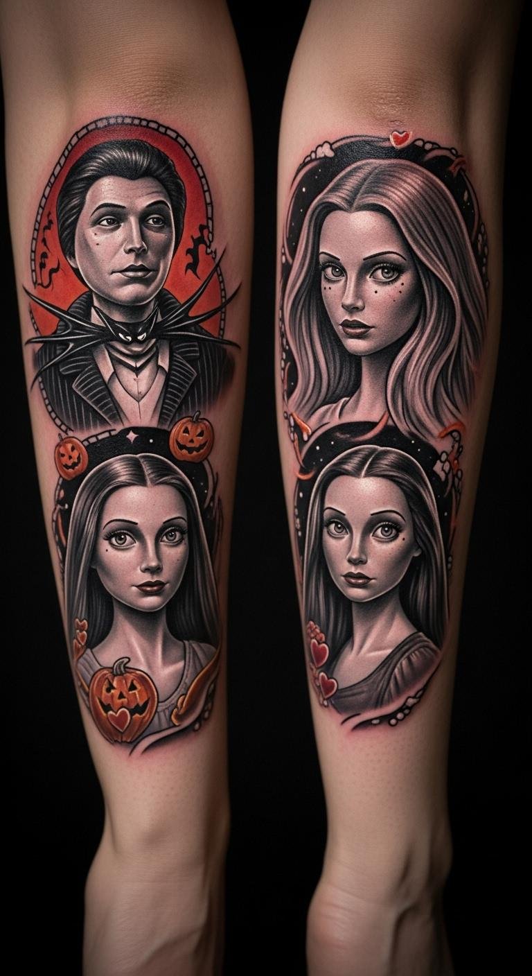 You can showcase intricate scene composition, where Jack and Sally’s romance intertwines with Halloween Town’s whimsy. This forearm placement transforms your skin into a canvas of nostalgia, expressing your love for the film while allowing endless creativity and personal connection.