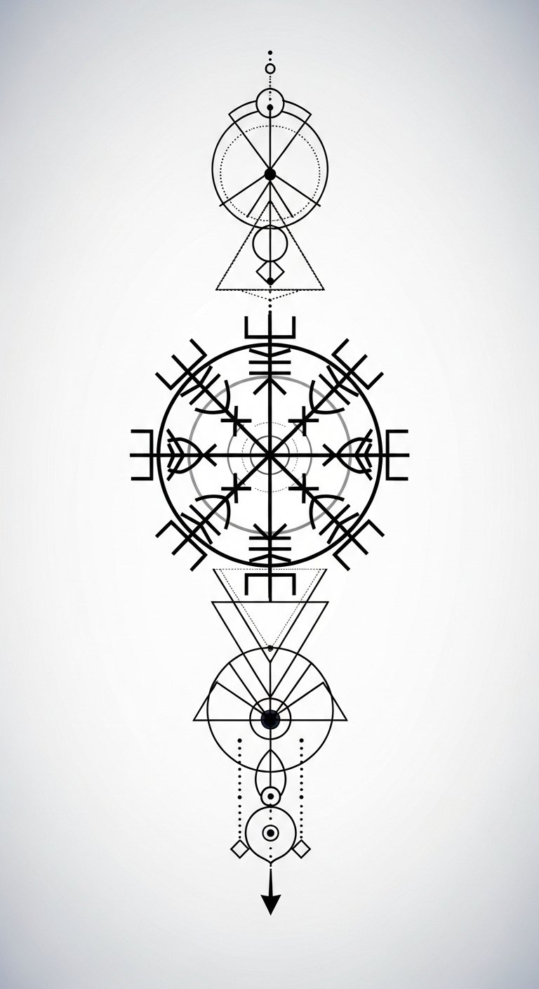 Geometric Vegvísir patterns transform the traditional runic compass into a modern masterpiece, fusing ancient symbolism with contemporary design elements.
