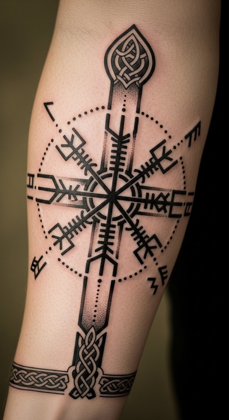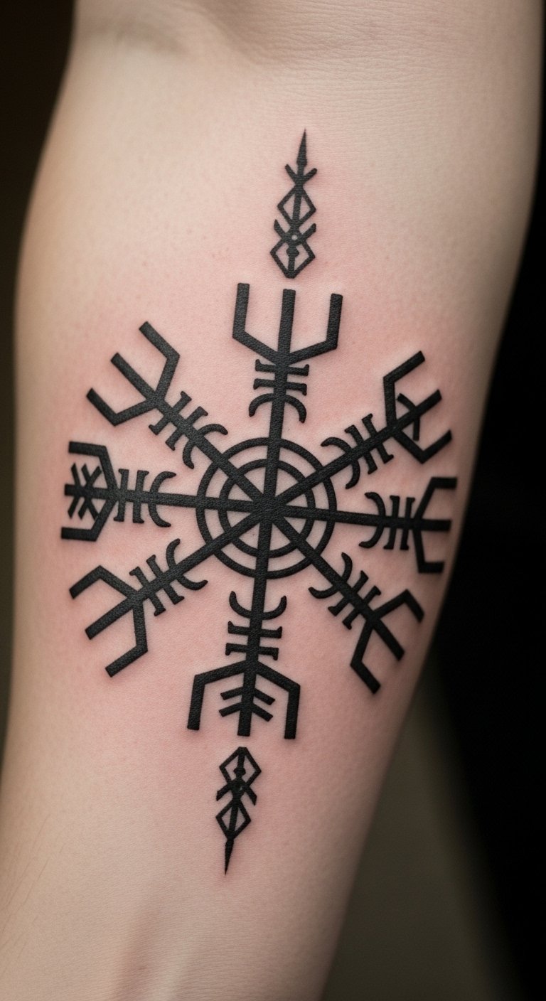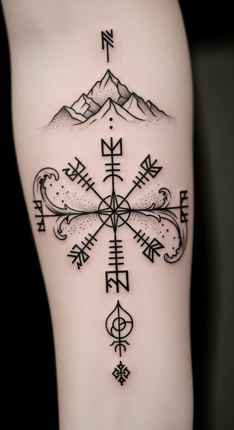 Visually it balances bold staves and delicate runic lines to convey both authority and intimacy, suited to the forearm where movement and visibility reinforce personal commitment.