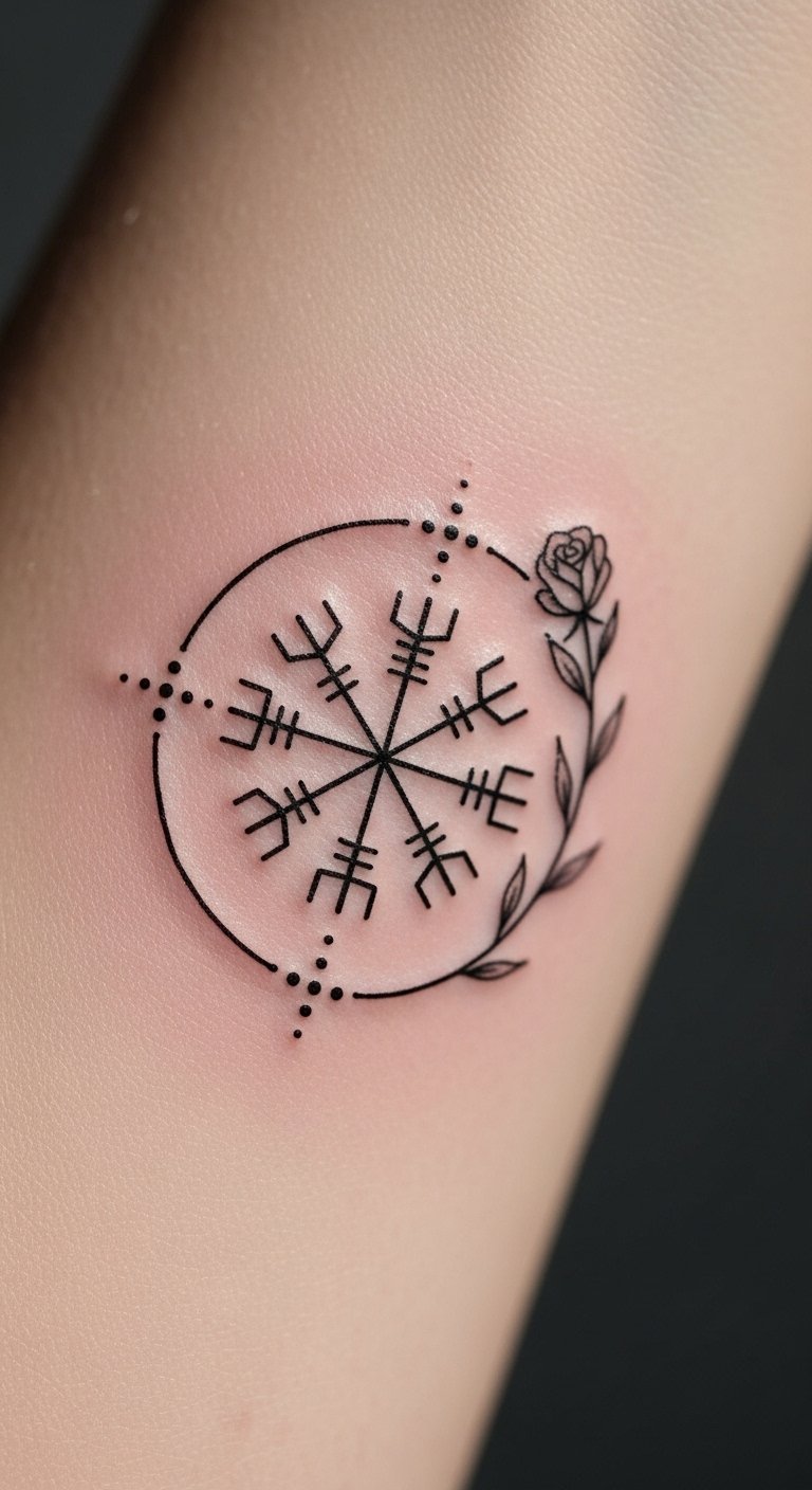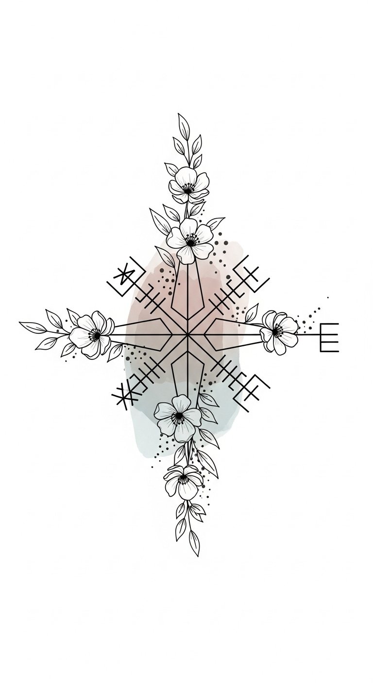 Building on the simplicity of minimalist Vegvísir tattoos, incorporating floral elements adds a vibrant touch that beautifully intertwines nature with ancient symbolism.