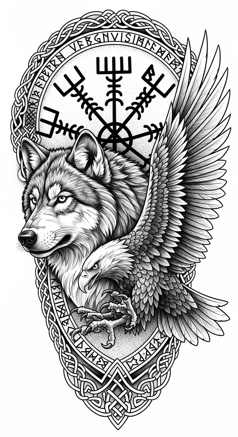 This composition balances the protective, pack-guidance energy of the wolf with the eagle’s perspective and freedom; fine-line and dotwork evoke quiet resilience and clarity.