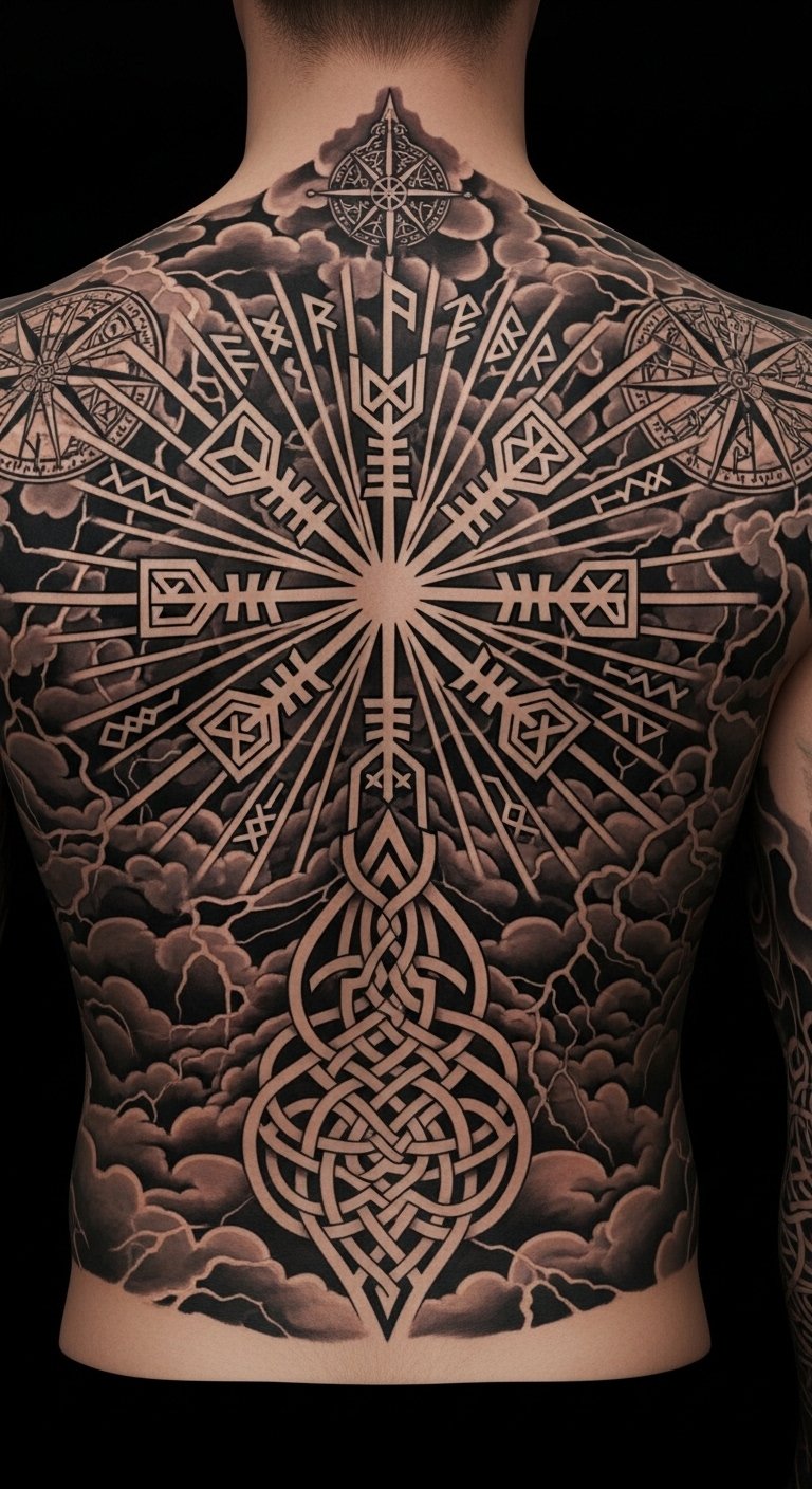 Incorporating the Vegvísir into a large back piece transforms it into a stunning visual narrative that embodies both strength and guidance.