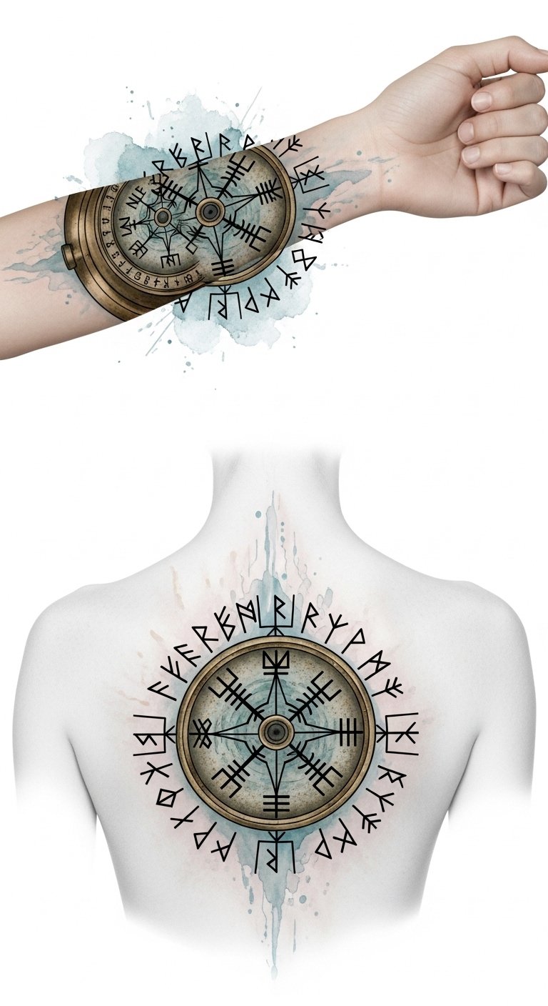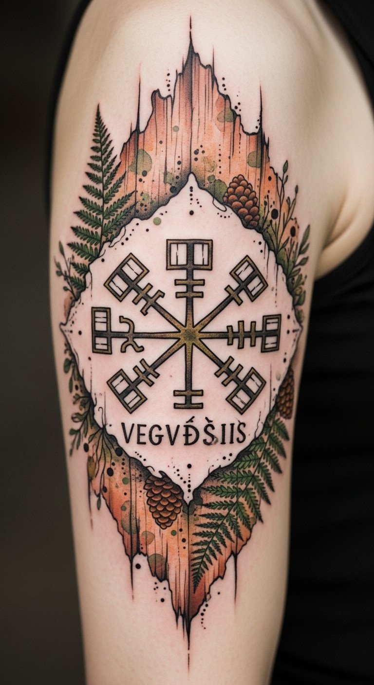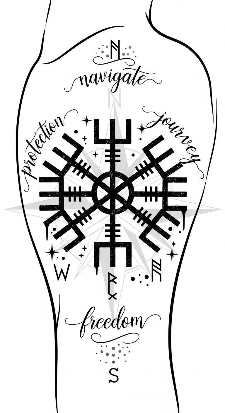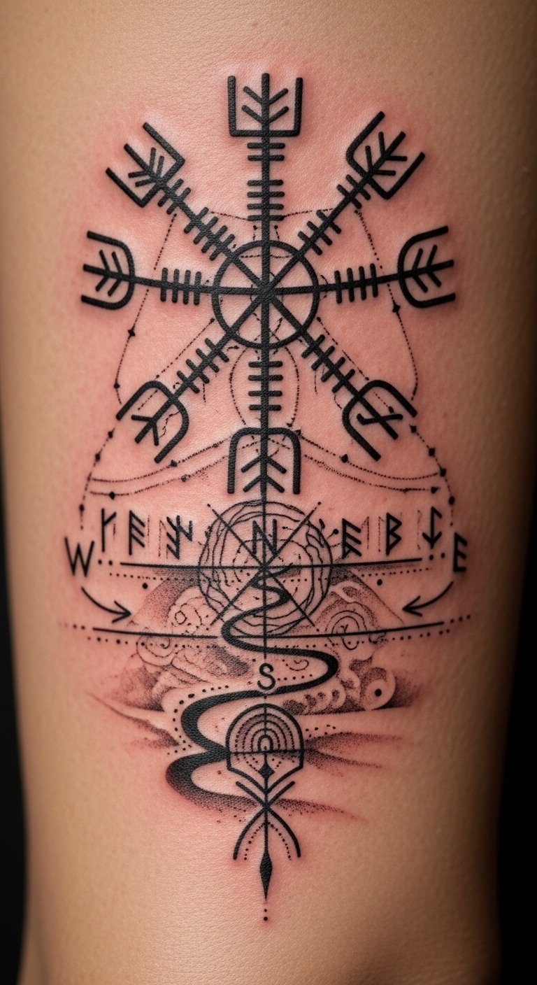 This tattoo beautifully captures the vegvísir significance as a protector in life’s journey while embracing compass symbolism, reminding you that your path is yours to forge.