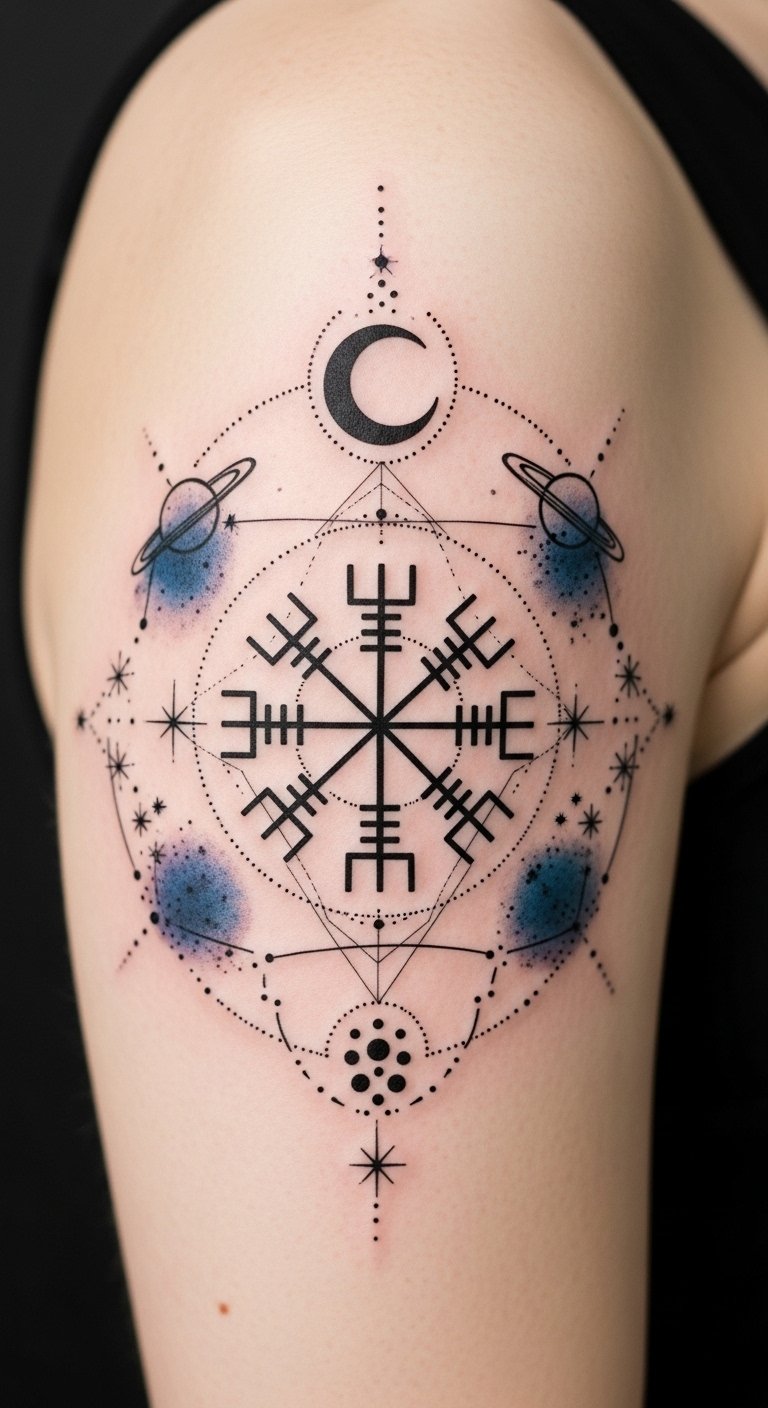 The composition evokes guidance and wonder—rooted protection from Norse tradition paired with the infinite possibility of the cosmos—meant to sit where you can see or conceal it: upper arm for personal strength or upper back for quiet guardianship, inspiring calm confidence and reflective introspection.