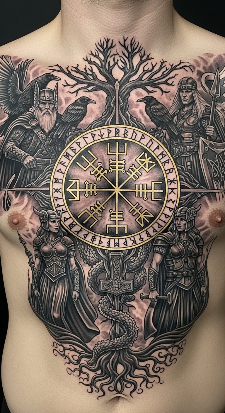 The chest placement centers the guiding compass over the heart, evoking protection and inner resolve; Odin’s ravens add watchfulness, Thor’s hammer conveys strength, Valkyries suggest courage in transition, and Yggdrasil ties the piece to life’s continuity—together creating a solemn, ancestral mood that balances mythic grandeur with intimate devotion.