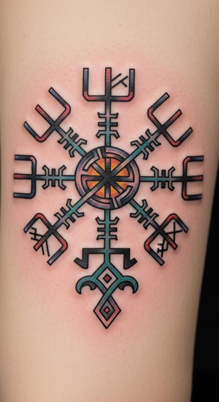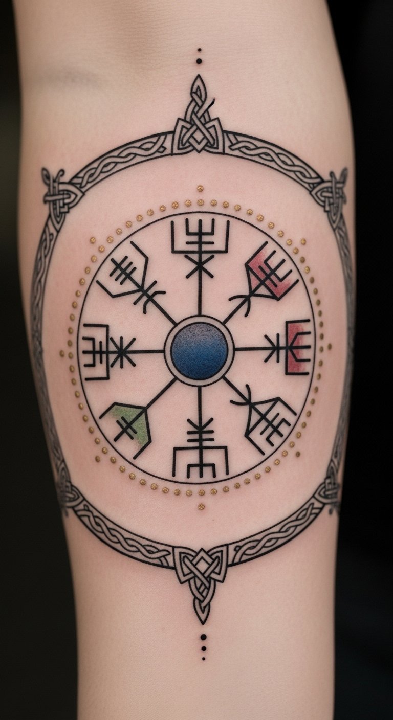 By thoughtfully choosing colors that resonate with your spiritual meanings, you can create a Vegvísir tattoo that not only guides you but also reflects your unique journey. This design uses blue for calm center grounding, red to mark driving passion and courage, green for growth and renewal, and gold for guidance and protection; emotionally it balances serenity and purpose.