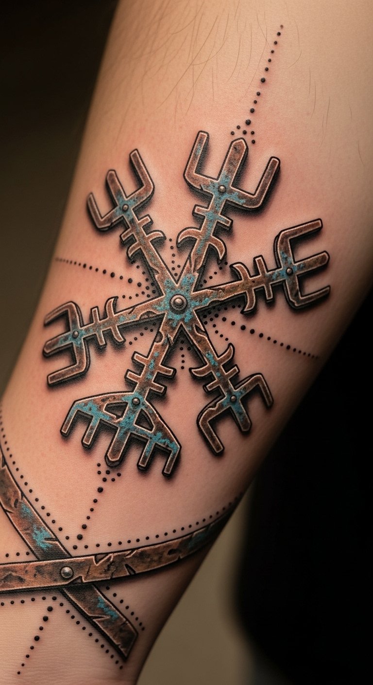 Placement on the forearm allows the design to be both visible and personal. The raised 3D treatment evokes resilience and permanence, the weathered metal texture and blue patina suggest endurance through time, and the overall composition conveys guidance, protection, and a quiet, steadfast confidence.