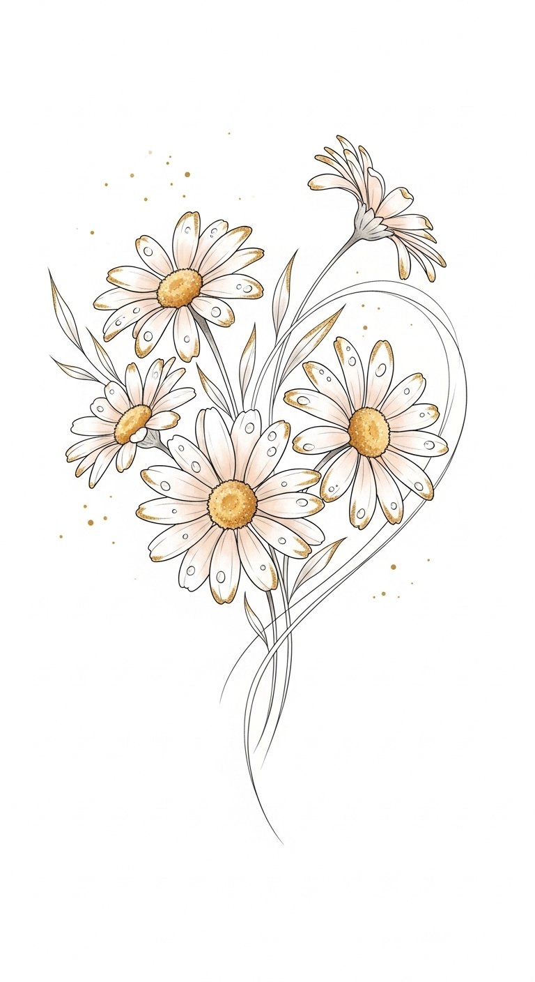 This design emphasizes gentle emotion and purity—daisies arranged into a heart convey tender affection and sincere intent; watercolor softness evokes vulnerability and freedom; fine ink lines keep it timeless.