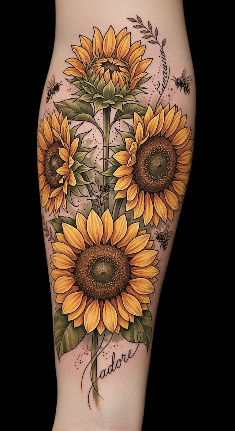 Embodying positivity, sunflowers invite you to embrace life’s bright moments, celebrating love and connection wherever you go. Let their spirit flourish on your skin. This design emphasizes growth and stages of life—bud to full bloom—conveying enduring loyalty and blossoming love; the warm palette and soft glow evoke joy and comfort, while the bees and script add intimacy.