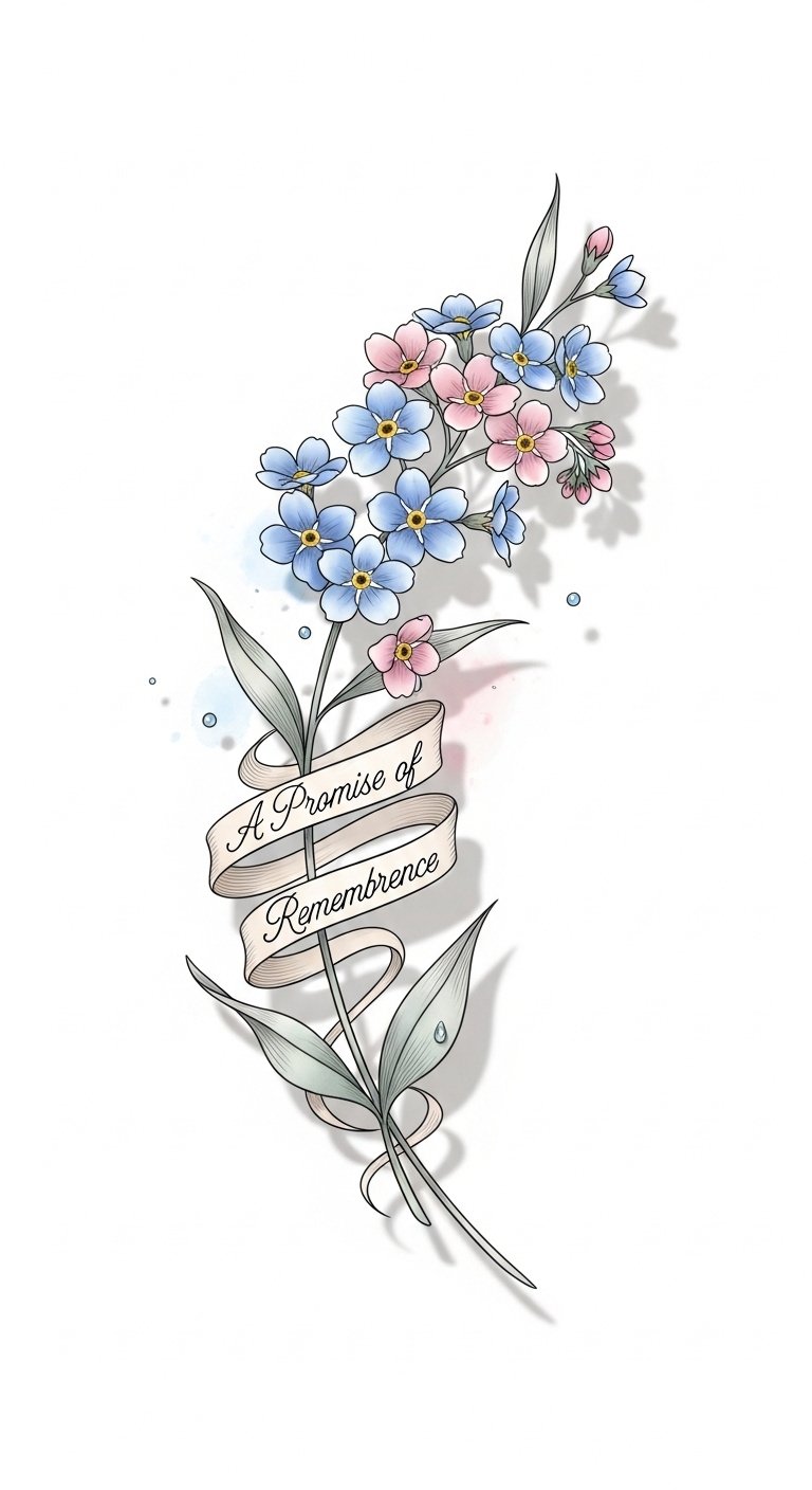 The tattoo design places the forget-me-not cluster along the natural curve of the forearm or shoulder blade to symbolize an intimate, wearable promise of remembrance; the soft watercolor washes and fine line details convey tenderness and enduring affection while the ribboned script reinforces the theme of loyalty, making the piece both emotionally resonant and visually delicate.