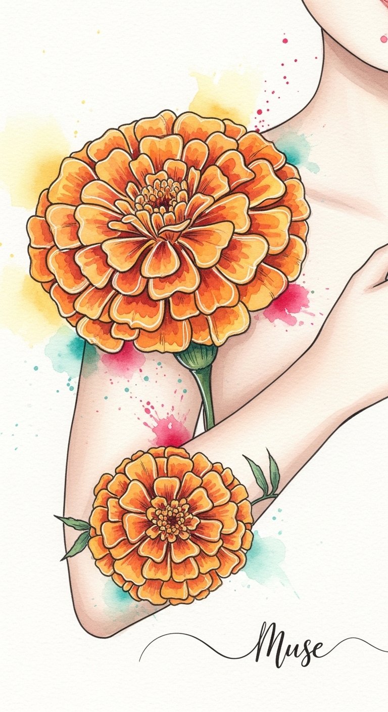 In ancient marigold mythology, these blooms were believed to inspire artists and lovers alike, symbolizing the fierce energy of life. A marigold tattoo can be your personal muse, celebrating the freedom to express your deepest passions and creative instincts.