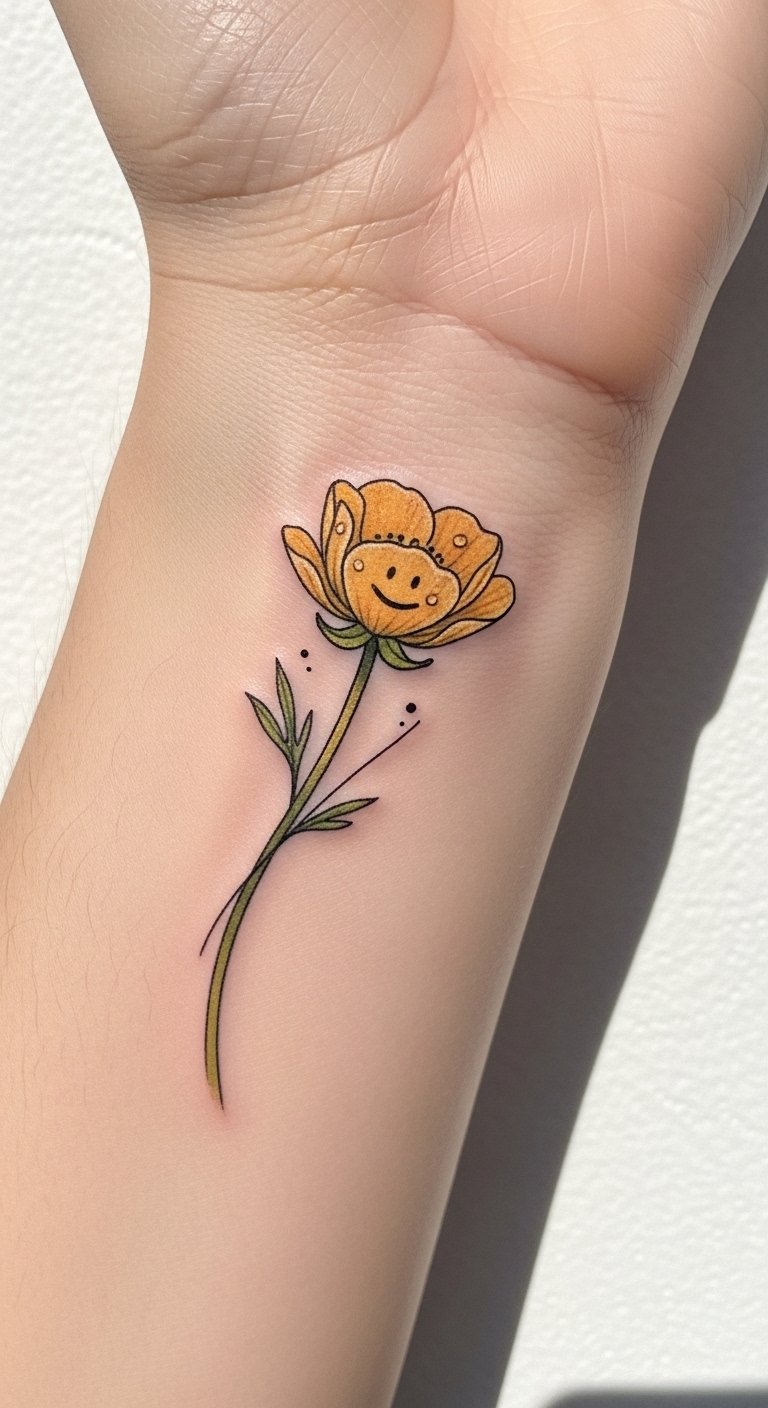 When you wear a buttercup tattoo, you embrace a spirit of optimism and freedom, letting the world know you cherish every moment with a smile. This tattoo concept emphasizes gentle cheerfulness and modesty through warm watercolor tones and a modest, wrist-wrapping placement that invites intimate viewing; it conveys lighthearted optimism and quiet humility, suitable for someone who wants an everyday reminder to stay joyful and grounded.