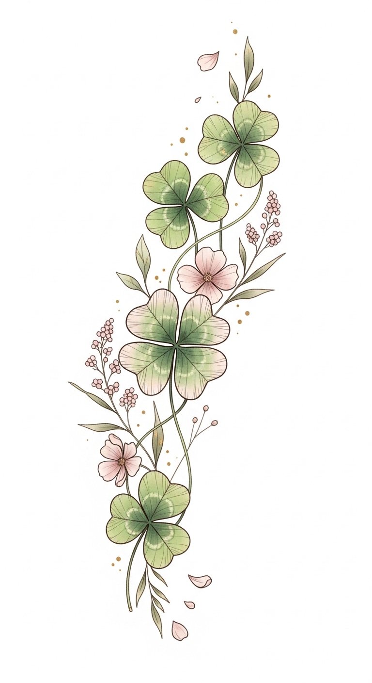 This design blends the hopeful energy of four-leaf clovers with the grounding simplicity of three-leaf varieties, evoking faith, protection, and serendipity. Soft watercolor tones and fine-line details create an intimate, gentle emotion — the piece feels like a personal talisman.