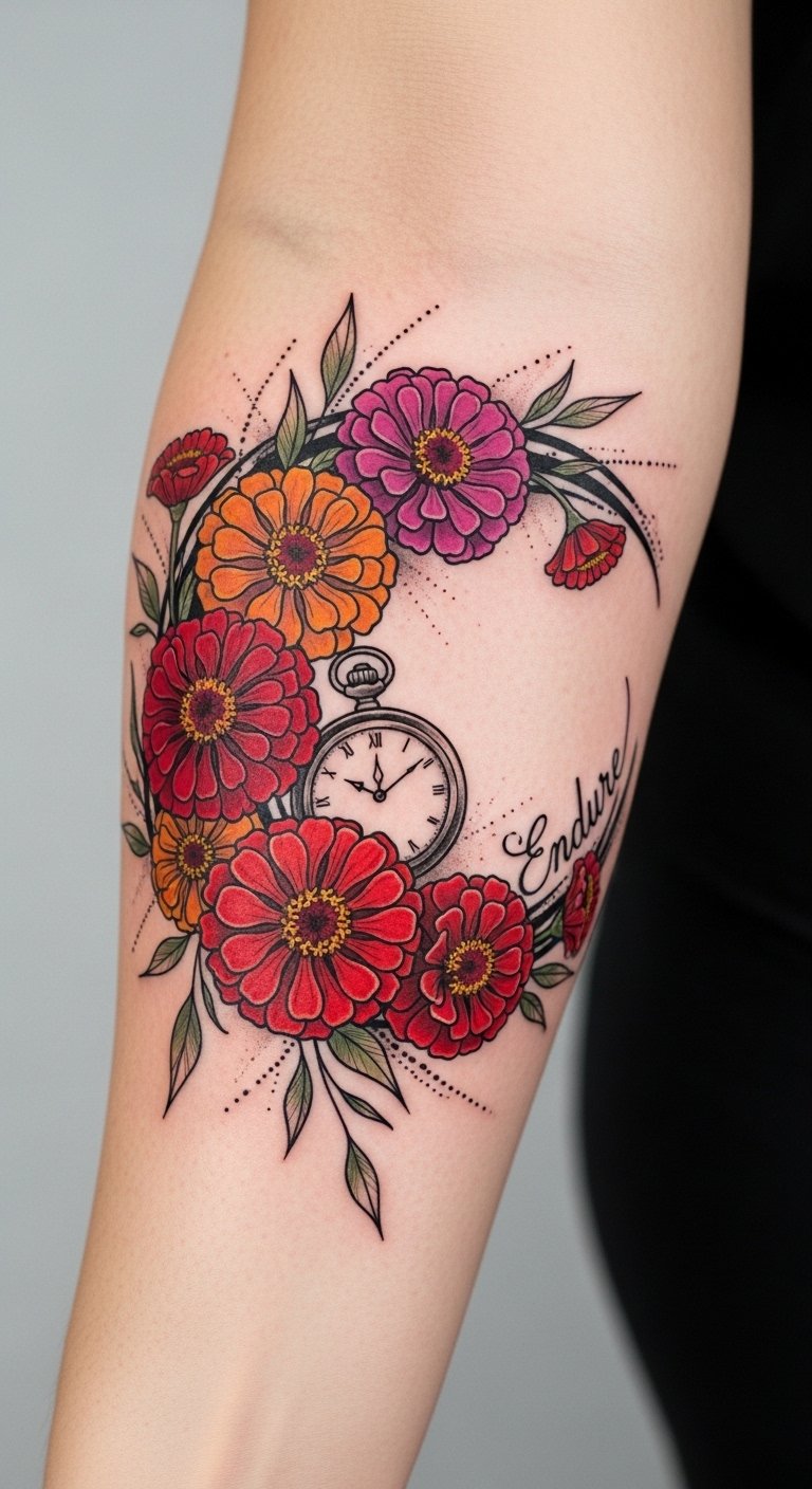 This design pairs the lively zinnia blooms with a vintage pocket watch to evoke the passage of time and enduring bonds; the watercolor hues convey warmth and joy while fine-line details and dotwork lend intimacy and permanence—ideal for a forearm placement where the crescent shape wraps the arm, readable and personal, expressing resilience and lasting friendship.