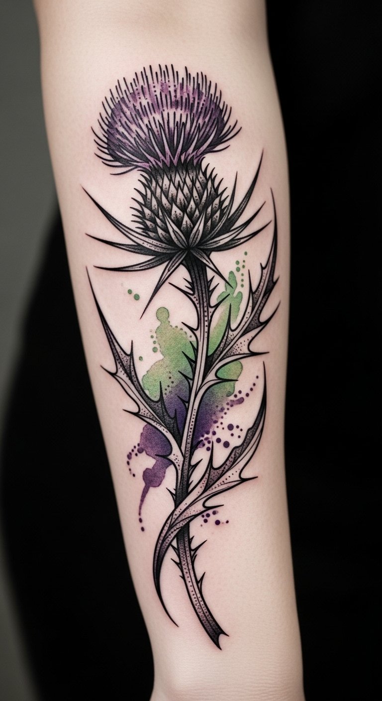 Embracing the thistle tattoo means honoring resilience and the beauty of overcoming challenges. Its bold, spiky nature reflects your unyielding spirit, reminding you that true freedom often arises from struggle.