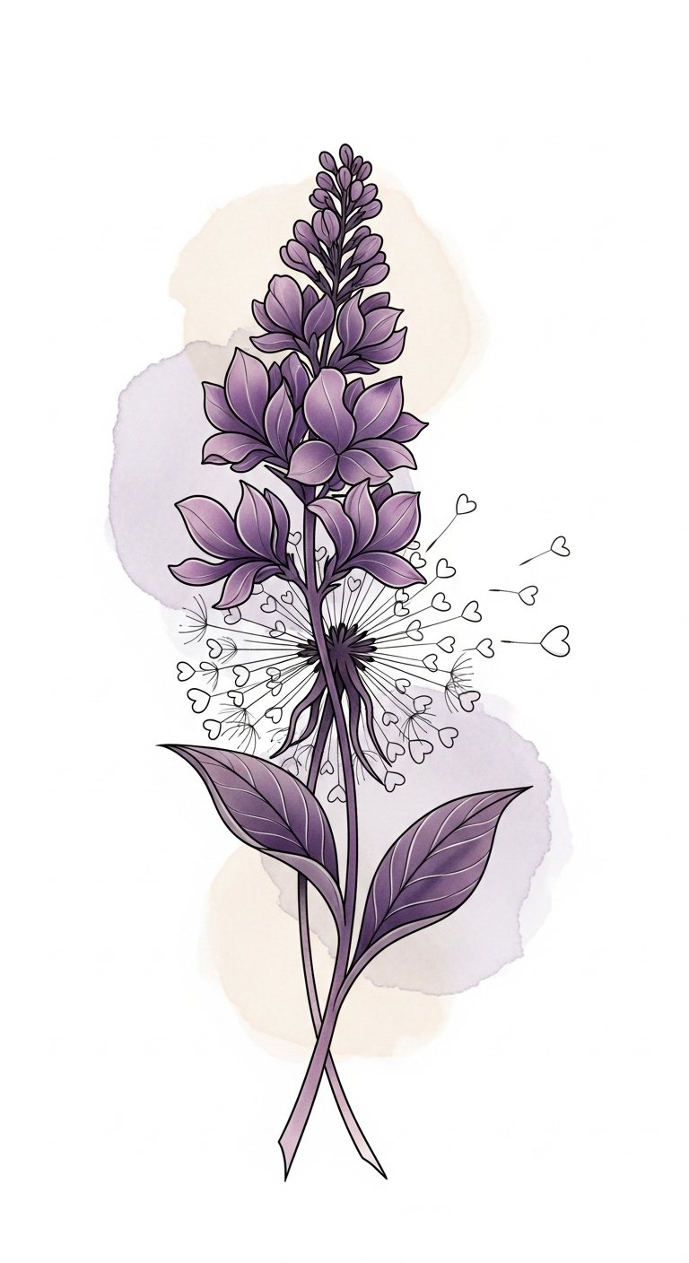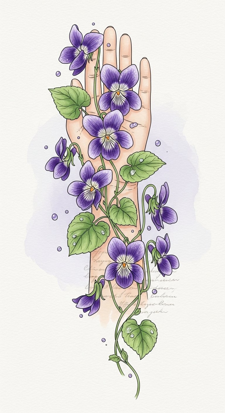 This design emphasizes the quiet strength of violets—soft colors and fine lines expressing modesty, flowing composition to evoke loyalty and continuity, and placement options (inner wrist for intimacy, forearm for visibility, ankle for subtlety) chosen to match the wearer’s emotional intent.