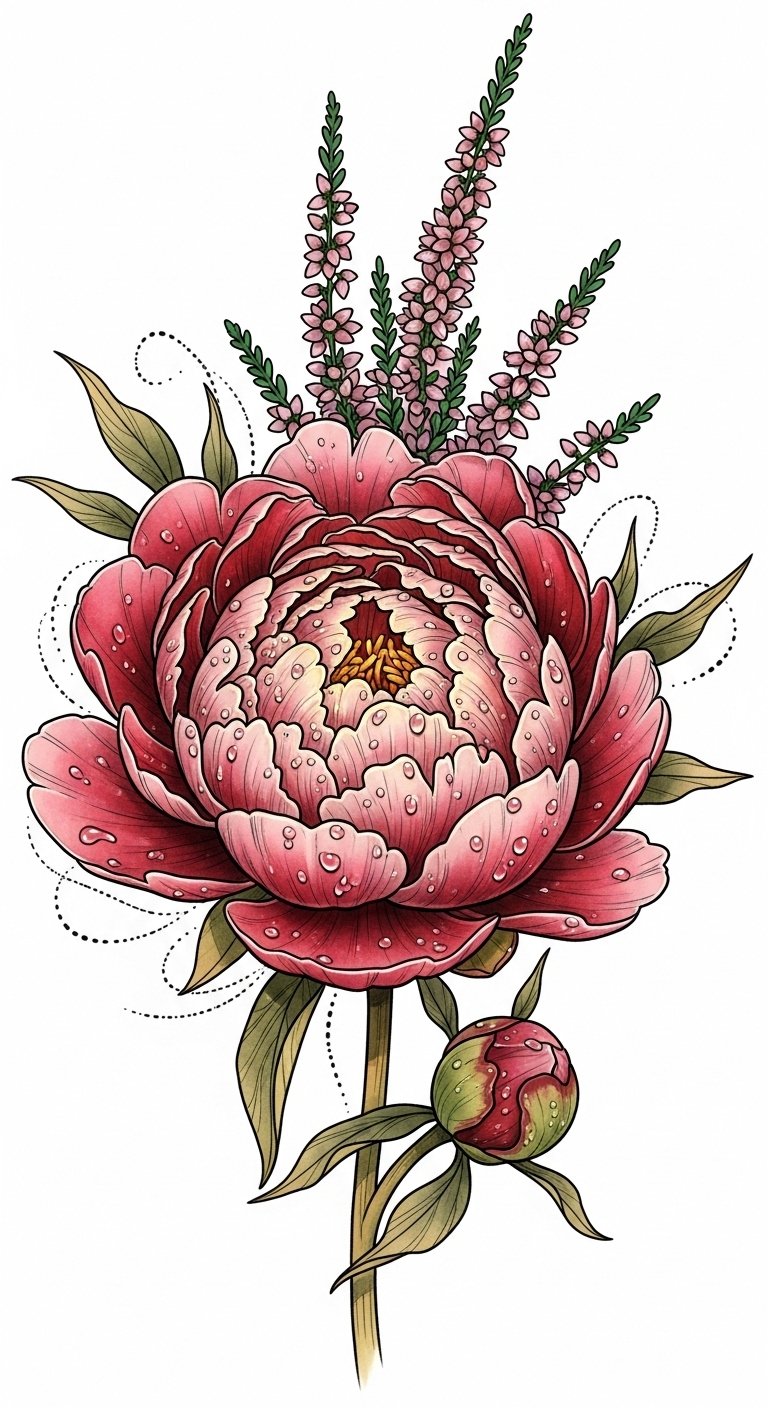 The design blends strength and delicacy—the heather represents protection and roots, the peony symbolizes flourishing luck—evoking warmth, optimism, and confidence.