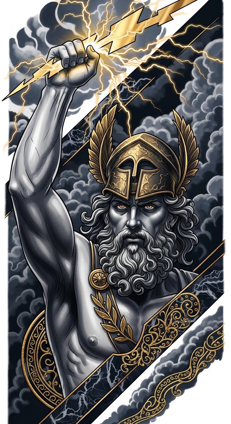 Place it across the chest or full back to mirror the breadth of Zeus’s dominion, using high-contrast tones to evoke awe and metallic highlights to draw the eye to the bolt — a focal point that anchors personal empowerment and command.
