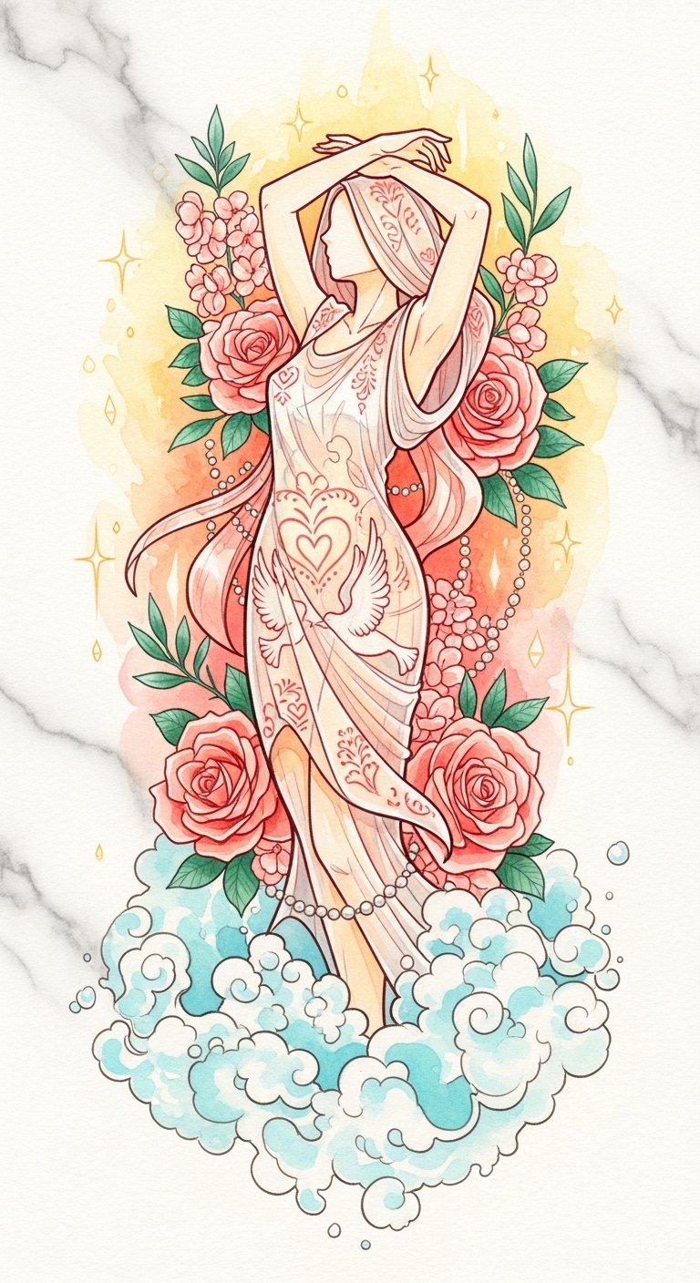 The design combines oceanic origin and classical beauty to evoke love, sensuality, and inner strength; roses and myrtle signify romantic devotion and fertility, pearls and soft light suggest purity and transformation, while placement on the shoulder blade or ribcage offers intimate connection and concealability, and the forearm allows daily expression — the overall emotion is tender, empowered, and timeless.