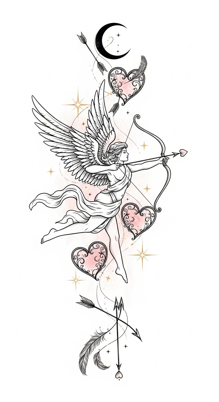 Let your Eros tattoo inspire you and ignite your inner strength in matters of the heart. This design combines classical mythic imagery and modern fine-line aesthetics to symbolize romantic longing, playful attraction, and liberated devotion; the heart-tipped arrow signifies intent and desire, wings and feathers suggest freedom and uplift, while the crescent moon and filigree evoke mystery and tenderness.