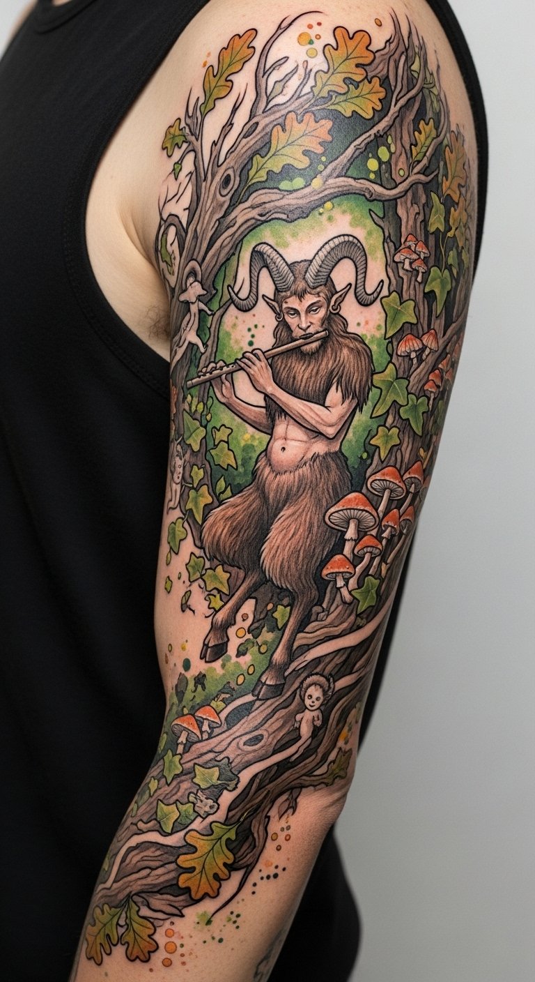 The design evokes playful mischief and primal calm—horns and flute signal music and instinct, oak and ivy represent endurance and growth, and hidden spirits suggest personal mystery; emotionally it balances wild freedom with rooted harmony, making it ideal for a sleeve or upper arm where the composition can curve naturally with the muscles and be expanded into a chest or back piece.