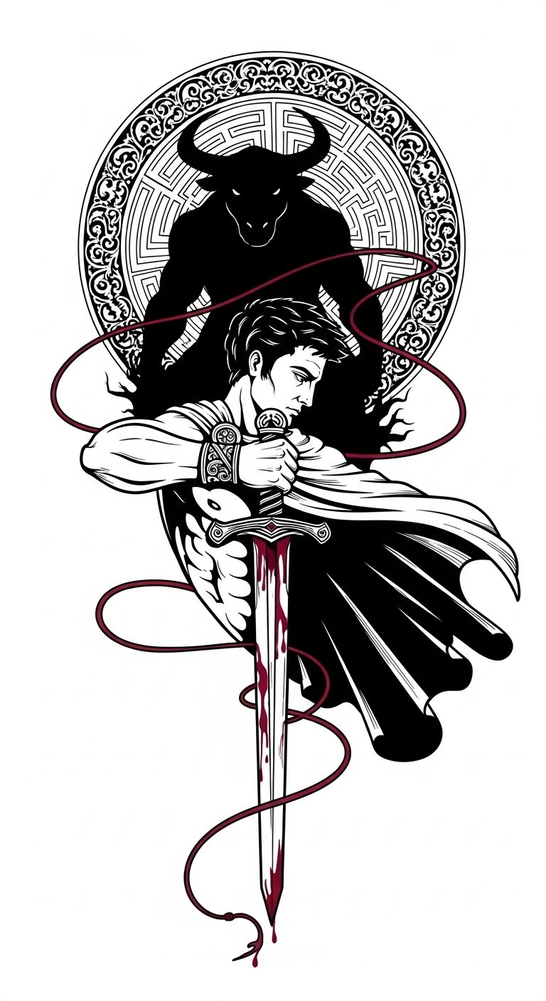 The Minotaur and labyrinth represent the trials and obstacles overcome, while the sword and thread symbolize courage, guidance, and resilience; crimson accents add emotional intensity and focus.
