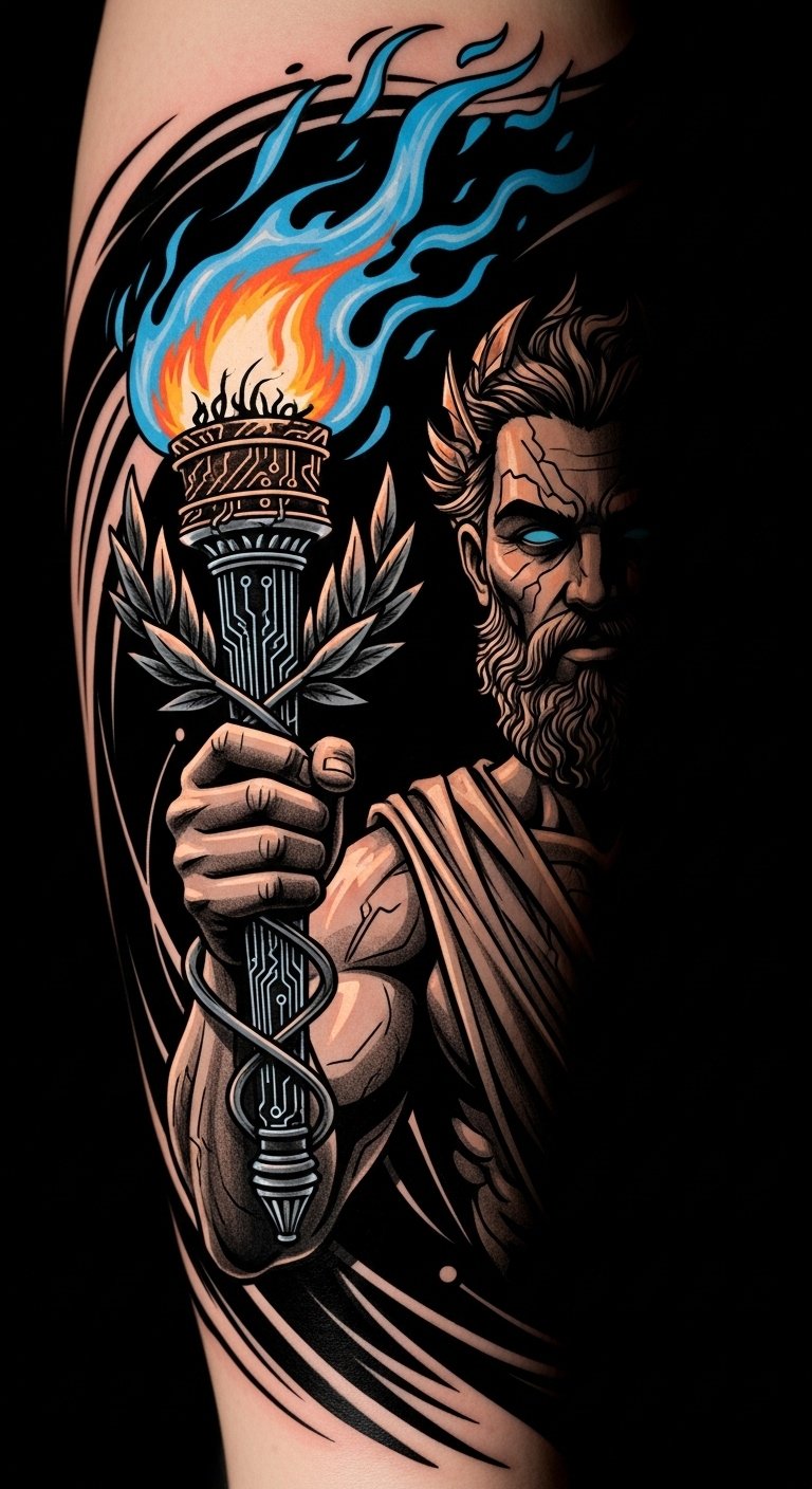 A compact, wearable design blending classical myth and modern motifs: the torch and flame represent the stolen fire and illumination, laurel for honor and sacrifice, and the circuit-like patterns signify knowledge and innovation; rendered with bold outlines and textured shading to convey defiance and raw energy, it evokes both resilience and hope—ideal on the forearm for visibility and personal statement or across the upper chest where it sits close to the heart, inviting contemplation and pride.