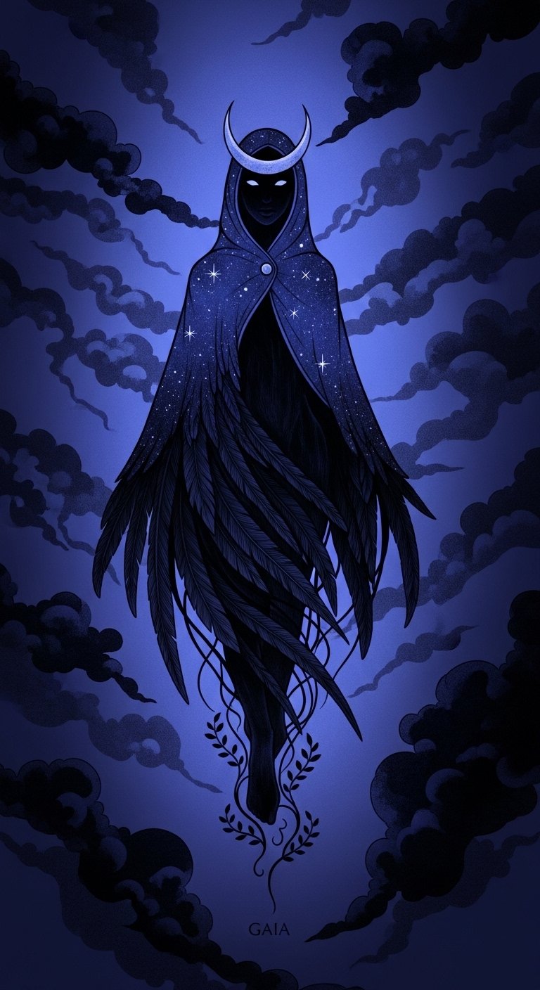This design blends celestial and earth elements to symbolize balance between darkness and grounding: Nyx’s crescent crown and star-speckled cloak represent intuition and cosmic guidance, raven-feathered shadows convey transformation and protection, and the subtle Gaia vine roots at her feet honor origin and nurture.