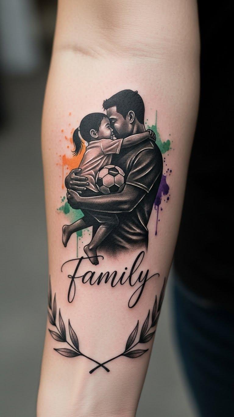 This design concept embodies the original text’s themes of inked love and connection by merging a tender parent-child embrace with a soccer ball to signify devotion both familial and athletic.