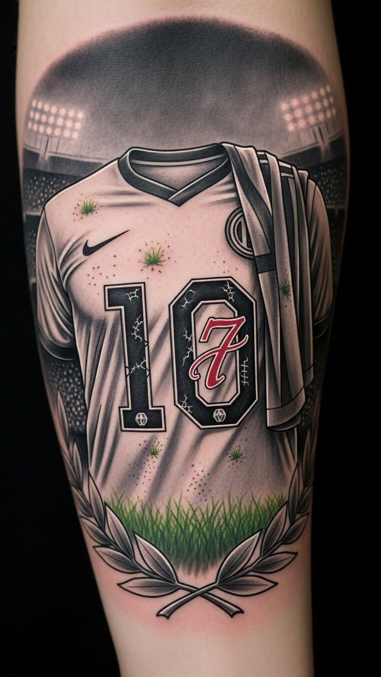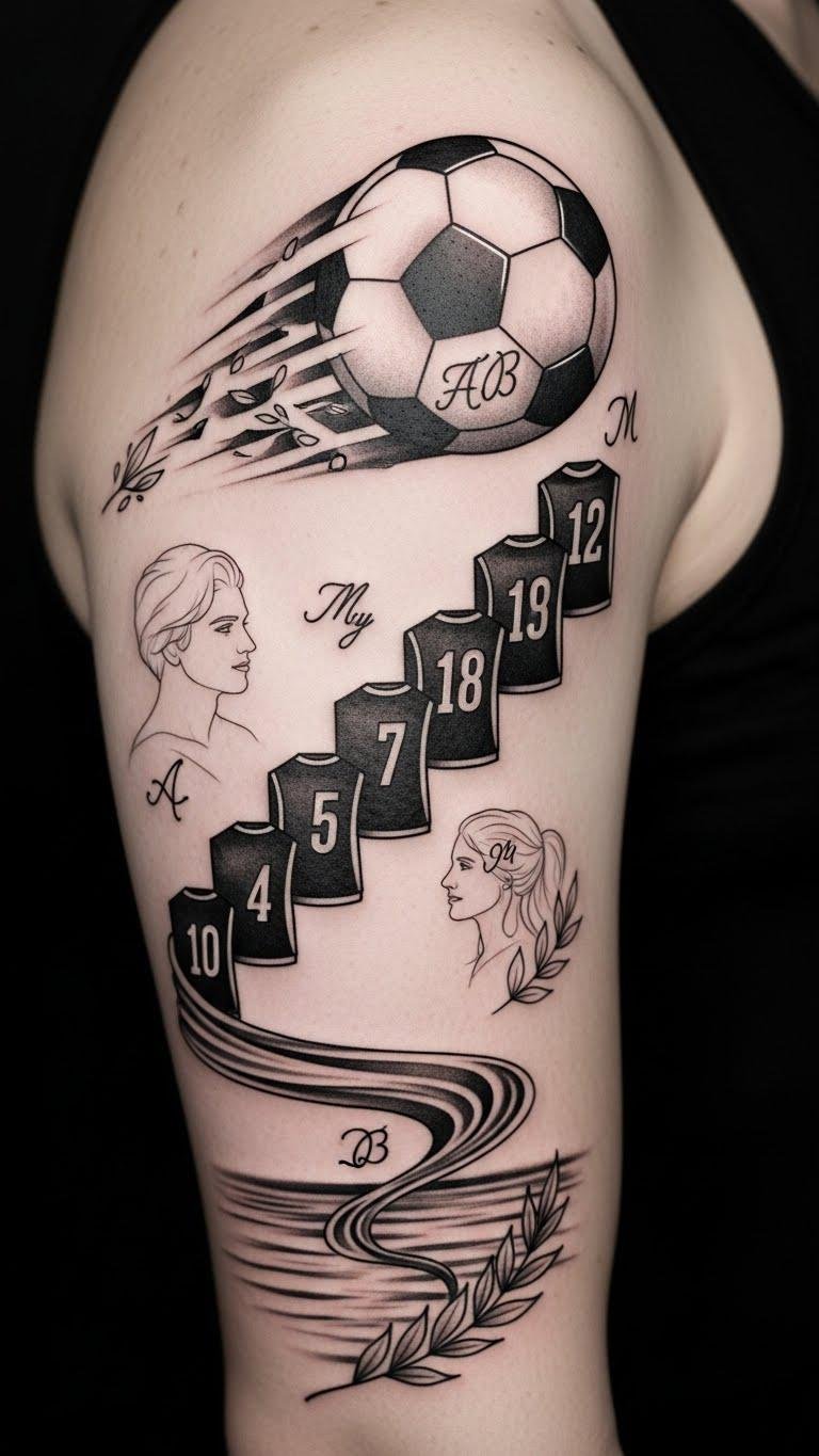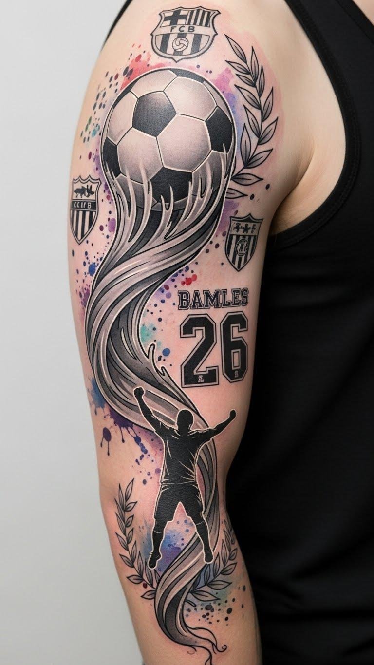 These tattoos embody the spirit and passion of the game, reminding you that your own legacy can be immortalized through unique body art. The design symbolizes the journey from individual skill (the realistic ball) to personal triumph (celebrating silhouette), with club crests and the jersey number honoring affiliations and milestones; laurel wreaths denote victory and remembrance, while watercolor splashes convey passion and emotional ties.