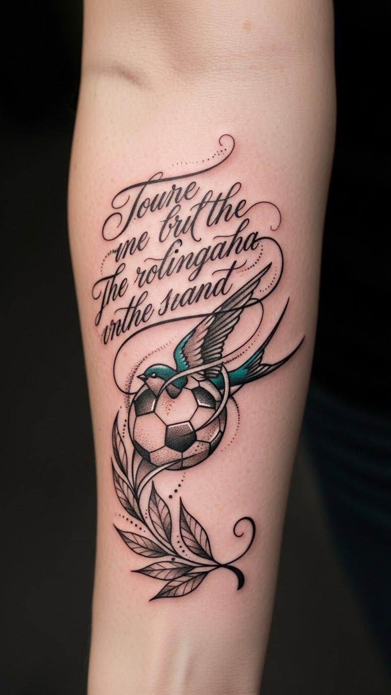 This design layers meaning: the quote expresses personal ethos, the soccer ball represents dedication and the sport that shaped you, the swallow symbolizes freedom and return after hardship, and laurel leaves denote victory and growth.