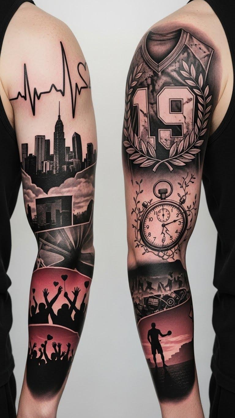 The heartbeat-to-skyline line symbolizes life and origin, the jersey number and laurel speak to identity and achievement, the broken stopwatch with vines conveys time lost and growth from setbacks, and the fan silhouettes plus lone trainer evoke community and solitary dedication—placed as a flowing sleeve that wraps muscle hollows and highlights movement, intended to evoke resilience and motivate during competition.