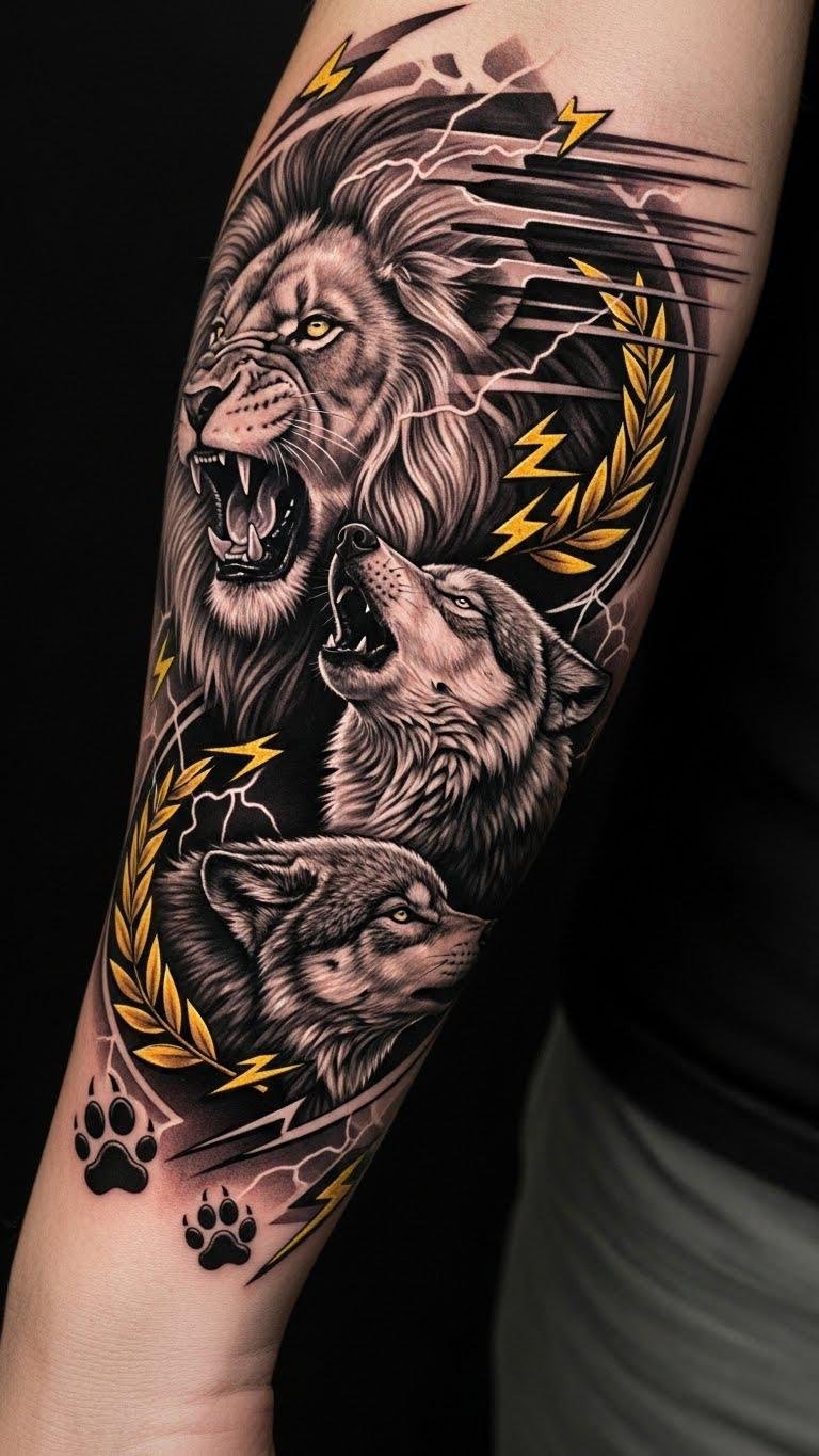 This forearm placement allows the composition to wrap naturally with muscle movement, the lion positioned toward the hand to signify forward leadership and the wolf toward the elbow to indicate supportive unity; the design evokes fierce determination, camaraderie, and a competitive spirit, ideal for athletes seeking visible motivation and emotional grounding.
