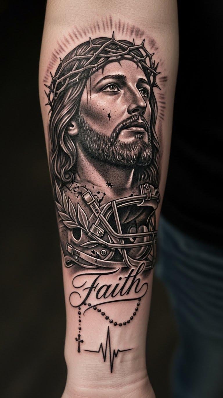 The design merges personal devotion and athletic identity: Jesus’ compassionate gaze grounds the piece in spiritual solace, the helmet strap and laurel wreath honor perseverance and victory in sport, the rosary-to-heartbeat motif symbolizes prayer as life’s rhythm, and the flowing “Faith” script ties the elements together.