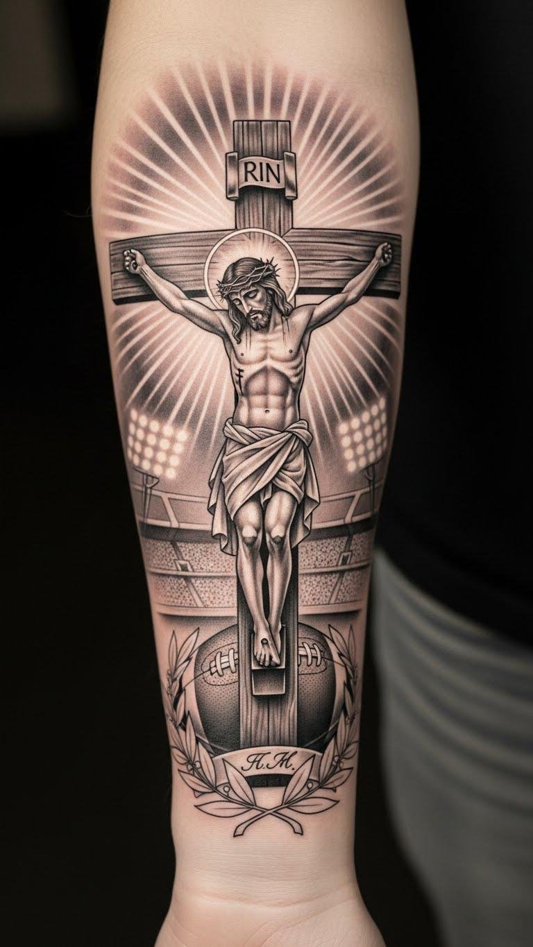 This design weaves the given faith expressions into a personal emblem: the crucifixion and cross anchor spiritual conviction, the serene Christ and halo suggest peace and guidance, stadium lights and football textures connect the belief directly to athletic life, and the laurel wreath and initials honor achievement and roots.