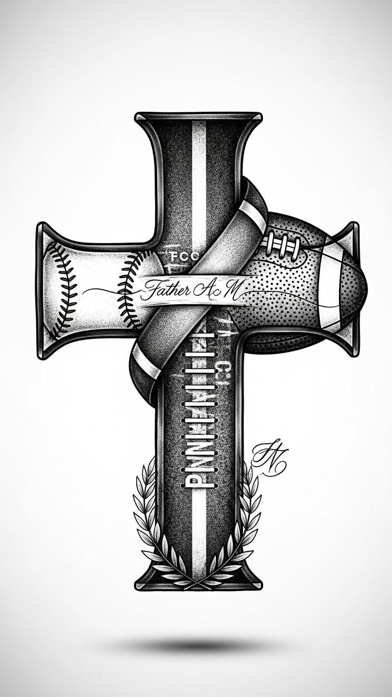 It’s more than ink; it’s a representation of the values passed down through generations, igniting your passion and determination on and off the field. The design weaves sport-specific textures into a classic cross to anchor memories of a father’s guidance, evoking resilience and gratitude; placed on the inner forearm it reads as a personal pledge, on the chest near the heart it honors lineage close to emotion.