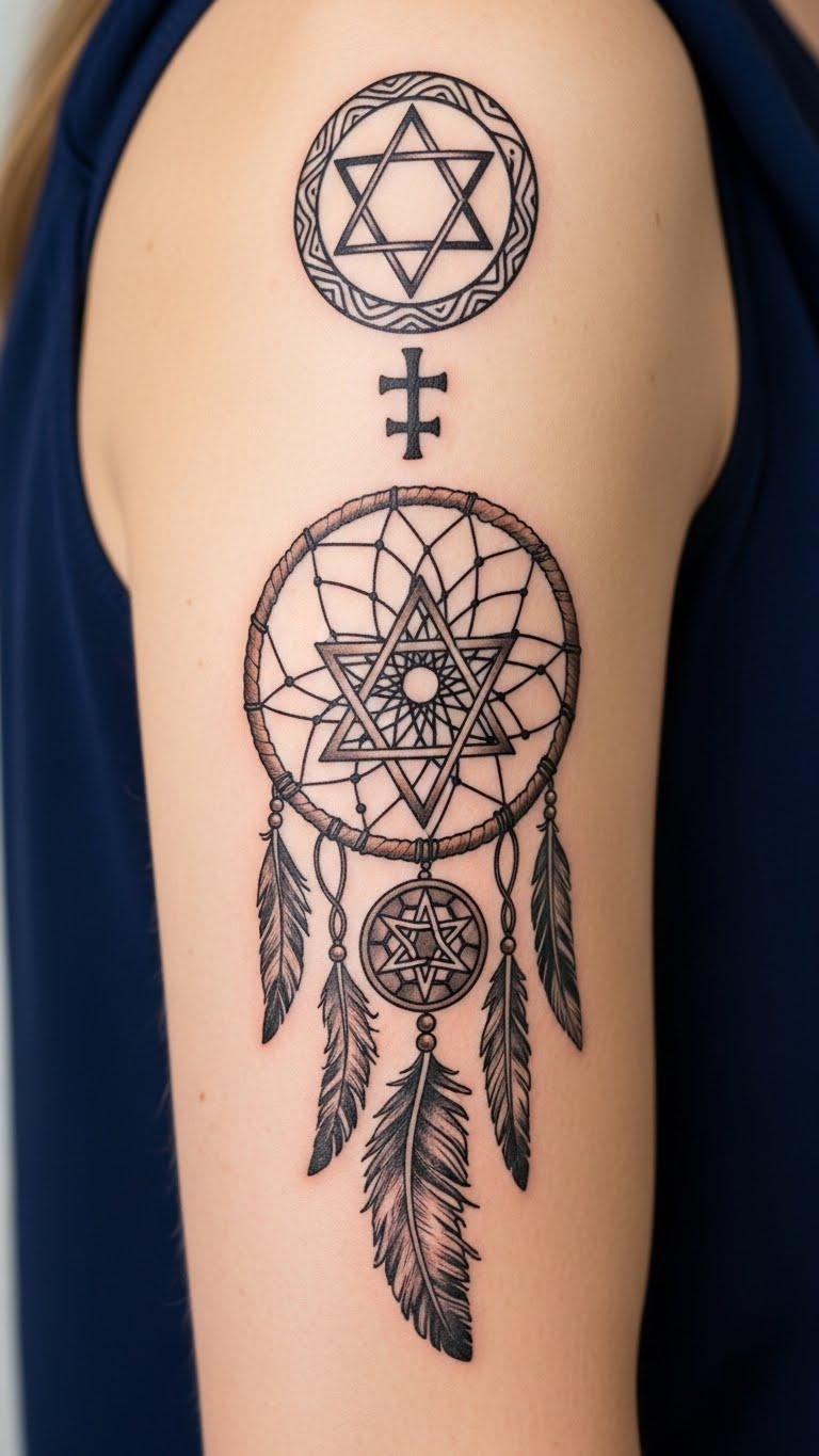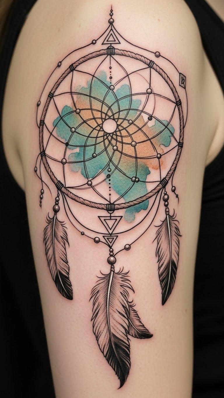 A layered forearm tattoo combining a detailed dream catcher with geometric hexagram elements woven into its web, accented by subtle tribal linework and soft dotwork shading; central bead is a small compass rose, feathers transition into stylized waves and laurel leaves. Symbolically it merges protection, guidance, and victory—dream catcher filters harm, hexagram balances spirit, compass points toward purpose, laurel and waves speak of triumph and emotional flow. Emotionally the piece feels grounding and empowering; ideal placement is outer forearm or upper arm where the wearer can see it often, serving as a visible reminder of resilience on and off the field.