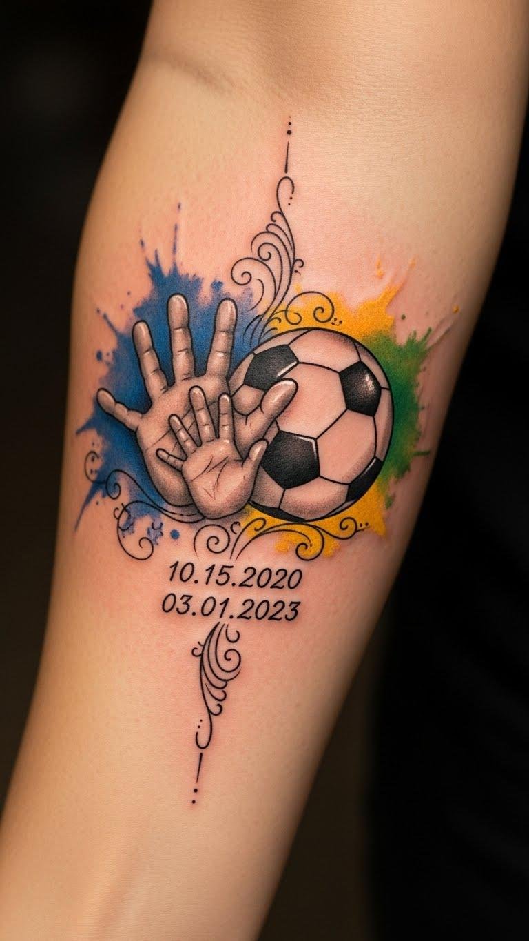 The design weaves the given inked memories into a single intimate piece: the child handprints symbolize familial bonds and personal legacy, the soccer ball silhouette anchors the subject’s passion for the sport, and the script dates mark cherished moments.