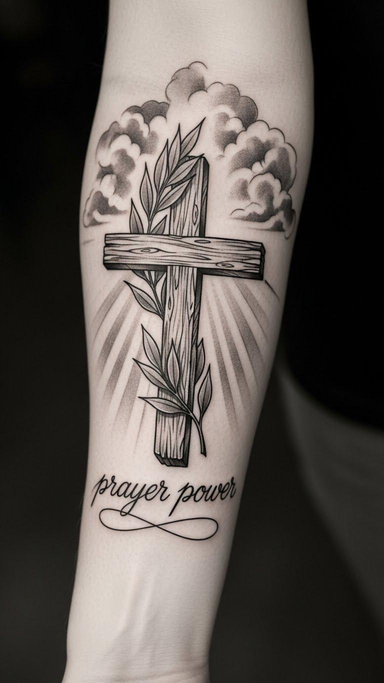 The design combines the steadfastness of the cross with laurel leaves to symbolize victory through faith; rays and clouds evoke hope breaking through struggle, while the phrase “prayer power” anchors personal conviction.