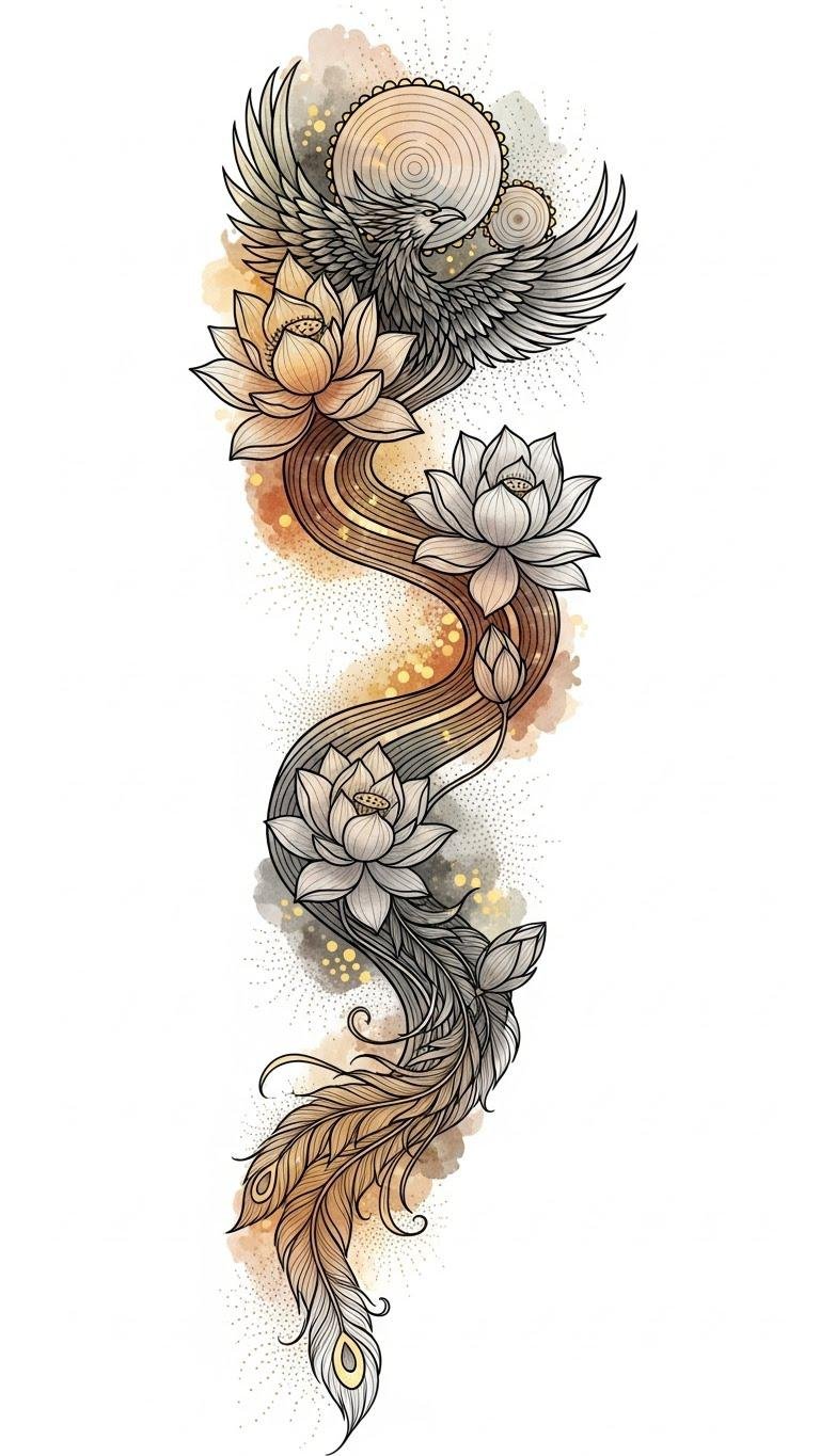 A visually layered sleeve concept that symbolizes continuous growth: the winding path represents life’s journey, lotus blooms indicate emergence and renewal, phoenix feathers signify resilience and rebirth, and tree rings mark time and personal evolution.