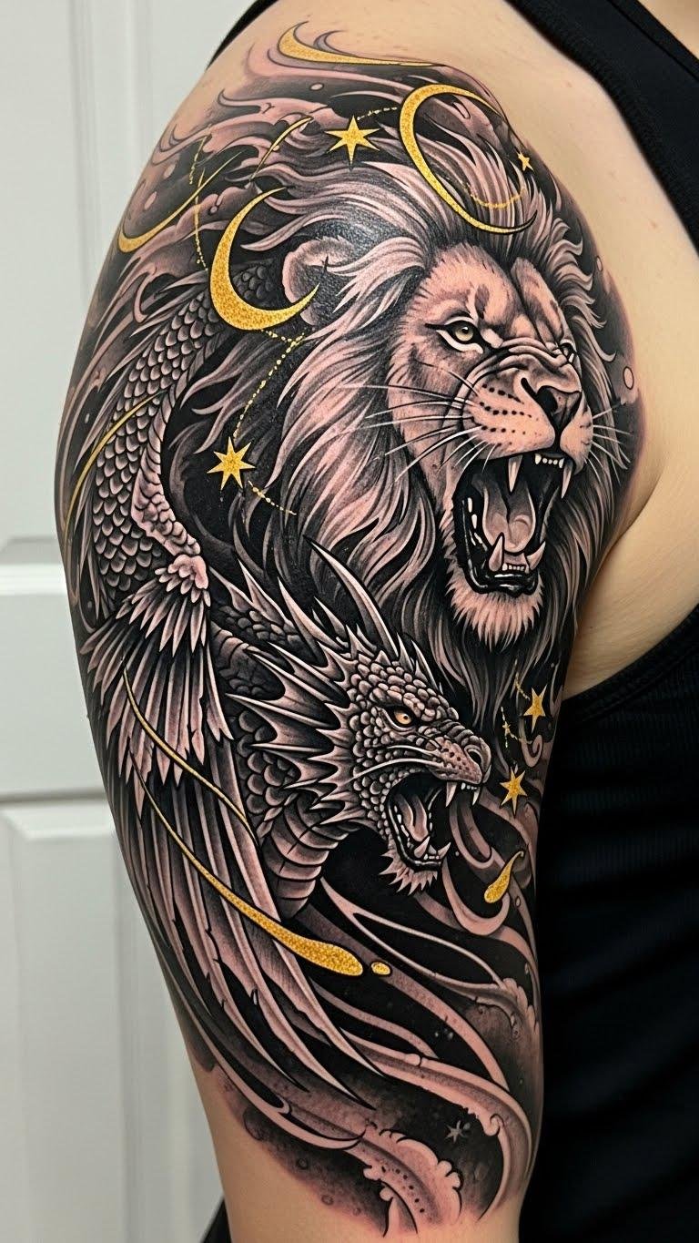 This design channels courage and determination through the lion’s roar and dragon elements, evoking protection and ambition; placed across the shoulder blade down the upper arm it accentuates muscular movement, conveys motion and confidence, and serves as a visible reminder of inner drive during competition and training.