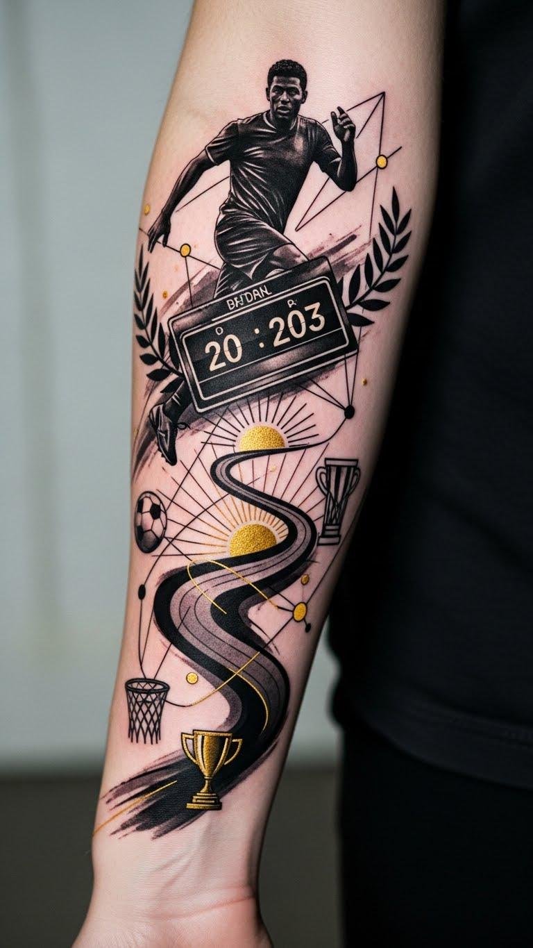The design blends realism and symbolism to honor resilience and progress—silhouette and path evoke motion and the rise toward goals, scoreboard and icons mark specific achievements, laurel and sun represent recognition and renewal; place this along the outer forearm or calf where its linear flow follows muscle movement, allowing the wearer to glimpse and feel the emotional weight of each milestone.