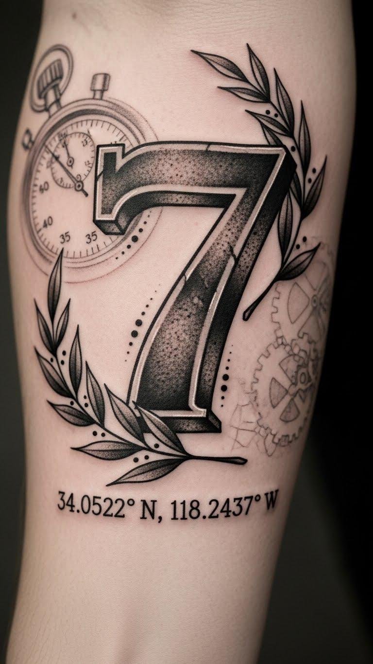 The design blends achievement (laurel wreaths, stopwatch gears) with personal memory (coordinates) to evoke triumph, time, and belonging; use on the outer forearm or calf so the numeral reads easily, allowing quiet pride and visible storytelling, with medium pain and strong visual impact.