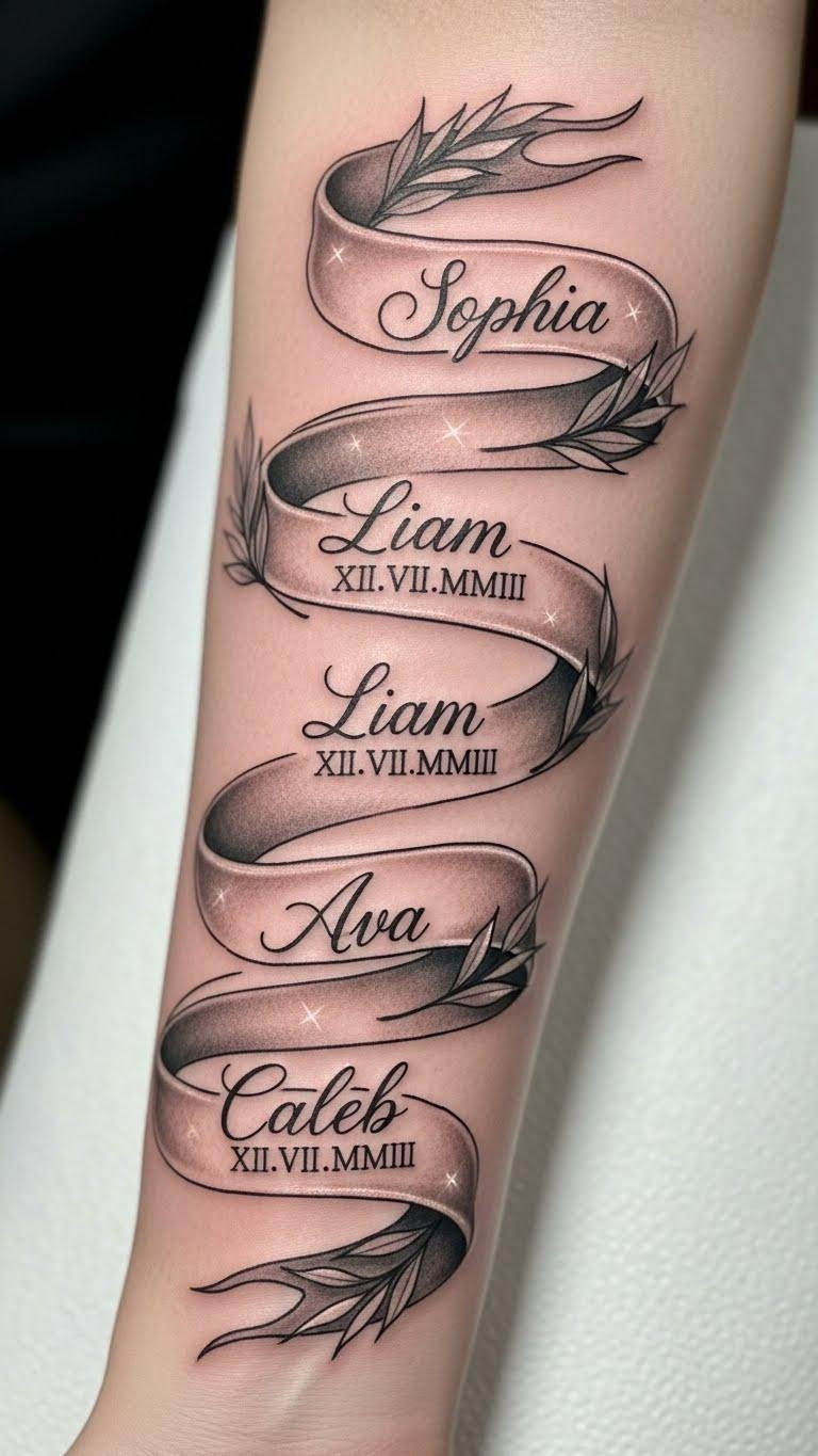 The ribbon symbolizes continuity and protection, laurel accents evoke honor and achievement, and the understated placement on the forearm allows for both visibility and intimacy—serving as a daily emotional anchor and a personal statement of belonging.