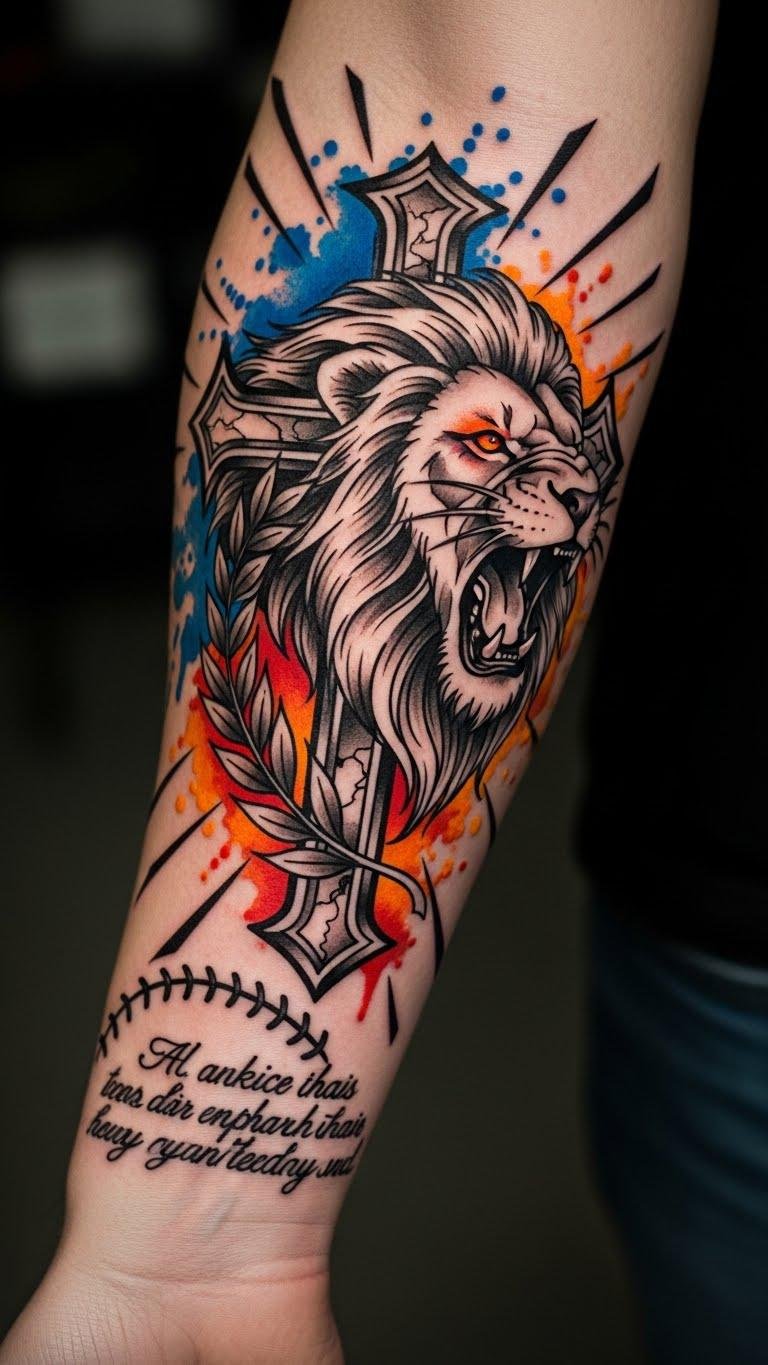 The design blends the cross (faith) and lion (courage) framed by a laurel for victory, watercolor team hues to tie identity and emotion, and a prayer script near the wrist for private focus; placed on the forearm it offers visibility during play and a personal reminder of strength, devotion, and perseverance.